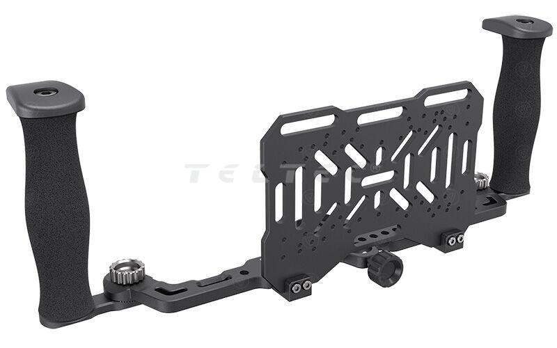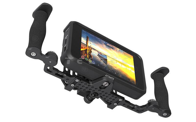 Der 8Sinn 8-DMCV2 Directors Monitor Cage V2 ist ein Basis Kamerakäfig mit Handgriffen, der für Monitore mit Bodenbefestigung geeignet ist. Die schaumstoffummantelten Griffe sind verstellbar und mit verbreiteter Oberseite, um einen sicheren Halt zu gewährleisten. Die Backplate ist mit M3-Befestigungspunkten ausgestattet, um V-Mount- oder Gold-Mount-Akkuplatten zu montieren. Drahtlose Sender hingegen können zwischen der Akkuplatte und der Rückseite des Monitors befestigt werden. Weiterhin gibt es die Möglichkeit Stative anzuschließen.