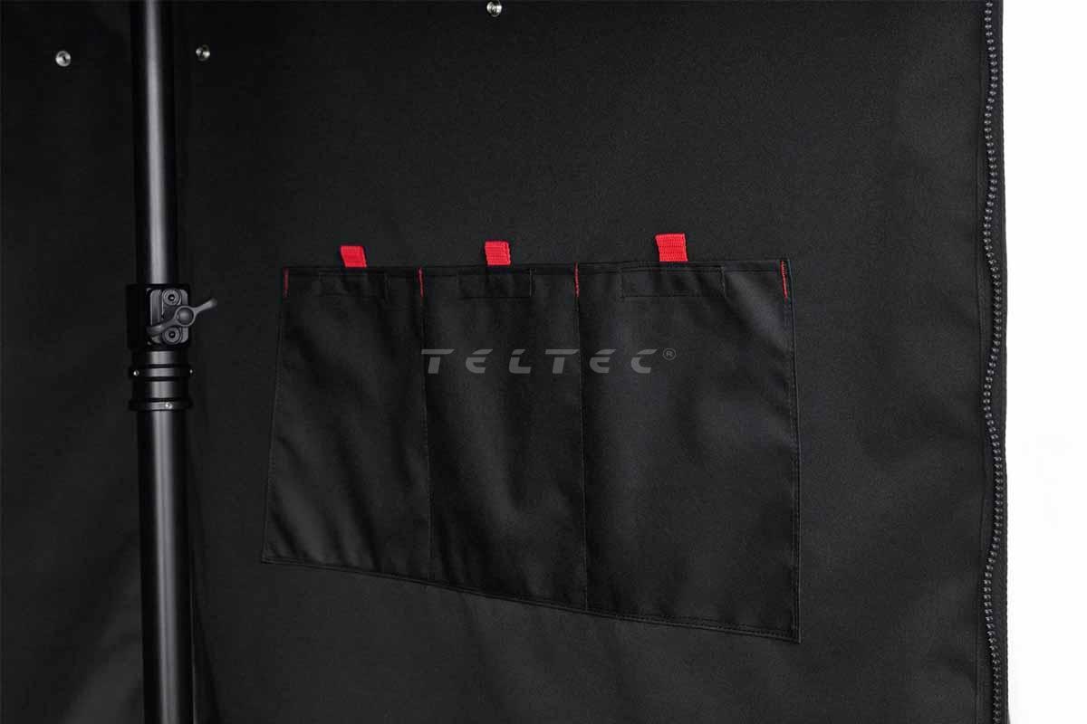 Das adicam Cart Tent with Mounting System ist ein Zelt für den adicam Kamerawagen, der zusätzlichen Schutz bietet. Die äußere Schicht ist mit einem Ripstop-Polyester ausgestattet, das wasserabweisend ist, während die innere Schicht aus einem UV-beständigem schwarzen Gewebe besteht, das zum Abdunkeln dient. Der Rahmen ist aus Aluminium gefertigt und verfügt über zwei 16-mm-(5/8")-Bolzenlöcher, die zur Montage an 2-teiligen Zeltrohren mit Baby-Pins dient. Das Zelt ist zur Verwendung mit Kamerawägen geeignet, die kleiner als 1,2 x 1 m sind. An jeder Ecke des Zeltes sind Reißverschlüsse, sodass die Seitenwände aufgerollt werden können. Weiterhin gibt es Klettverschlüssen an den Seiten, die an den Beinen des Wagens befestigt werden und zusätzlichen Schutz bieten. Zur Verankerung am Boden sind Einhängepunkte mit Ösen im Lieferumfang enthalten.
