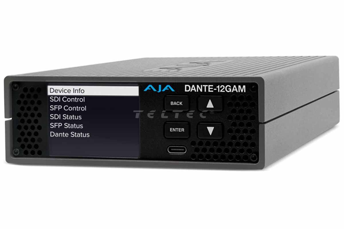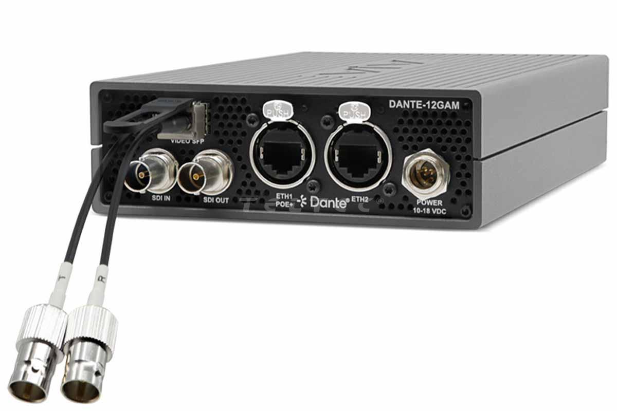 Der AJA DANTE-12GAM-TR-BNC ist ein Audio-over-IP (AoIP)-Konverter, der SDI-Audio in ein Dante-Netzwerk und von Dante-Audio zurück zu SDI embedded oder de-embedded. Zwei Videokanäle mit einem unabhängigen 12G-SDI-Ein-und Ausgang und zwei etherCON-GigE-Ports können gleichzeitig bis zu 16 Audiokanäle ein- und ausgebettet werden, sodass insgesamt 64 Audiokanäle mit einem Gerät unterstützt werden. Neben den Dante-Audioströmen, wird zusätzlich AES67 und SMPTE ST 2110-30 AoIP unterstützt. Der AJA Dante-12GAM wird mit einem einkanaligen 12G-SDI-Ein- und Ausgang geliefert, kann jedoch durch eine optional erhältliche Lizenz wie auch durch einen BNC- oder LC-Glasfaser-SFP auf die Zweikanal-Version aufgerüstet werden.