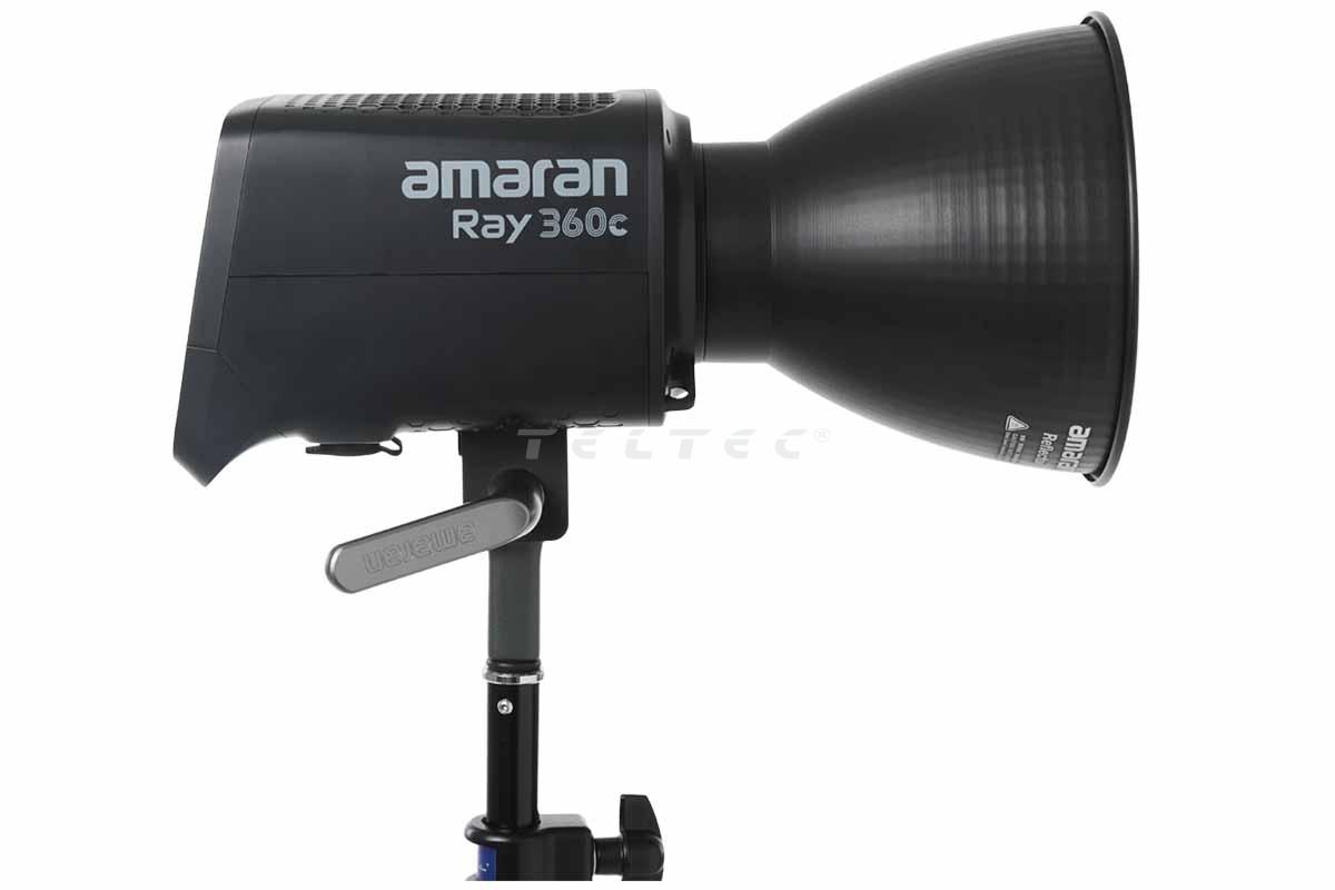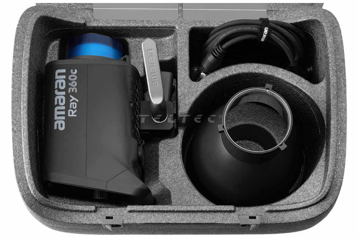 Die Amaran Ray 360c (EU) ist eine 360-W-Full-Color-COB-LED-Leuchte mit integrierter Stromversorgung und OmniColor Light Engine in einem wetterfesten IP54-Gehäuse. Sie liefert naturgetreue Farben und hohe Lichtqualität in einem kompakten Monolight-Design, das nur ein Netzkabel benötigt. Die DMX-Steuerung über USB-C macht sie ideal für professionelle Studio- und On-Set-Produktionen. Die integrierte Stromversorgung reduziert Zubehör und vereinfacht Transport und Setup. Das ausgewogene Lichtspektrum der OmniColor-Engine erzeugt realistische Farben, klare Weißtöne und präzise Hauttöne. Mit SSI-Werten von 87 (Tungsten) und 80 (D56) überzeugt die Leuchte mit konsistenter Farbwiedergabe. Mit bis zu 17.130 Lux @ 1 m bietet die Ray 360c eine beeindruckende Lichtleistung. Die Lichtausbeute kann durch den mitgelieferten Reflektor gesteigert werden. Optionales Zubehör wie Fresnel-Linsen* und Bowens-Mount-Softboxen* erweitert die kreativen Einsatzmöglichkeiten. Über den optionalen USB-C auf 5 Pin DMX Adapter* lässt sich die Leuchte nahtlos in professionelle DMX-Workflows integrieren. Der FlowTurn Drehregler ermöglicht schnelle oder präzise Anpassungen. In der amaran App lassen sich einzelne oder mehrere Leuchten bequem steuern, inklusive NFC-Kopplung.