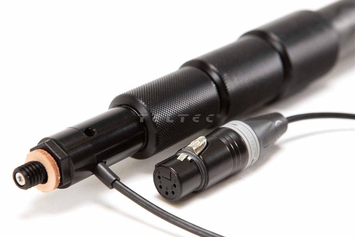 Das Ambient QP Slim Long with straight cable, stereo ist eine Tonangel mit gerader Innenverkabelung und seitlichem Kabelauslass. Die Tonangel ist aus Karbon-Verbundstoff gefertigt und aufgrund ihres geringen Durchmessers von nur 3 Zentimetern sehr angenehm zu halten. Darüber hinaus verfügt die Tonangel über 4 Segmente, sodass sich diese gegenüber des Vorgängers der QS-Serie, durch ein leichteres Design auszeichnet. Die Verschlüsse sind so konzipiert, das eine Vierteldrehung nun vollständig ein seitliches Verdrehen verhindert. Die QuickPole Slim Long bietet eine Verlängerung von 155 cm bis 518 cm und wiegt ca. 835 g.