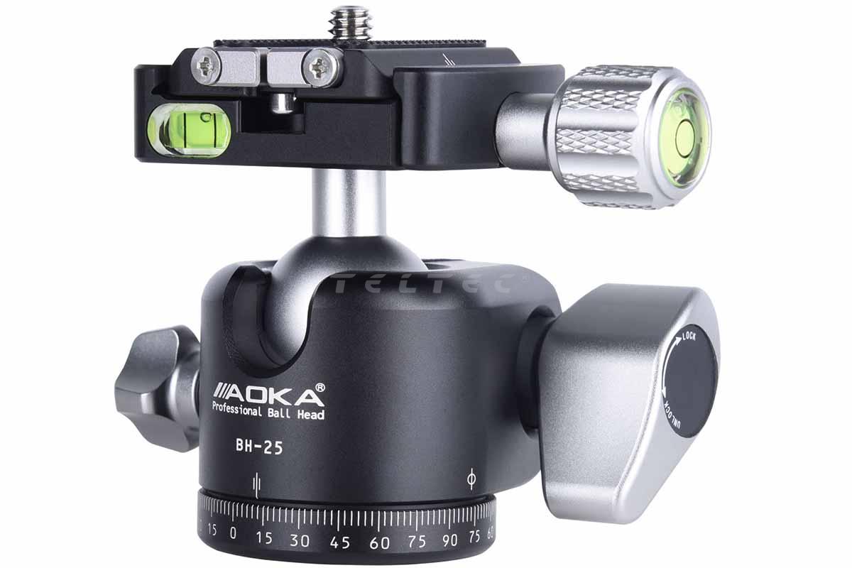 Der AOKA BH25 ist ein robuster Vollmetall-Kugelkopf für extrem hohe Traglasten. Mit Panoramadrehung inklusive Skala in der Basis, Wasserwaage zur exakten Positionierung der Kamera sowie feiner Friktion. Eine solide und große Kugel mit präziser Klemmung sorgt für optimale Stabilität. Die Stativplatten besitzen eine Verdrehsicherung. Die 2 einschwenkbaren Pins für den Anschlag am Kameragehäuse verhindern bei Hochformataufnahmen und Panoramen das Wegkippen der Kamera auf der Platte.