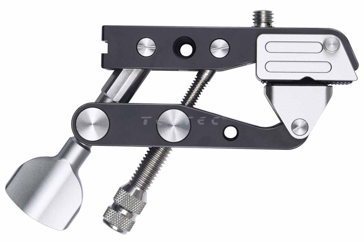 Die AOKA SC96 ist eine universelle stabile Klemme, mit vielen ¼“ und 3/8“ Bohrungen zu fast jeder Seite, für allerlei Anschlussvarianten. Große Klemmweite bis 8 cm. Durch die Schnabelform auch für Rohre geeignet. Mit ¼“ Schraube und 3/8“ Übergewinde auch direkt für Kugelköpfe geeignet.