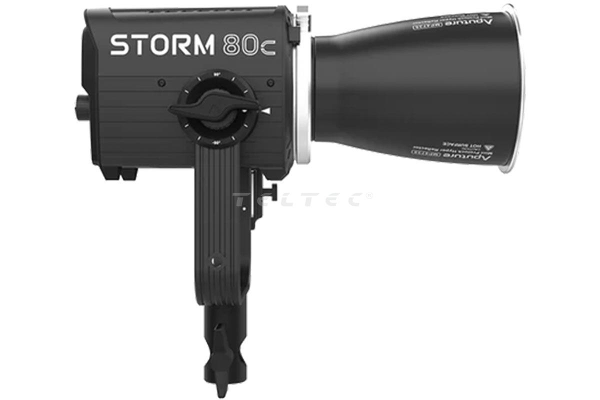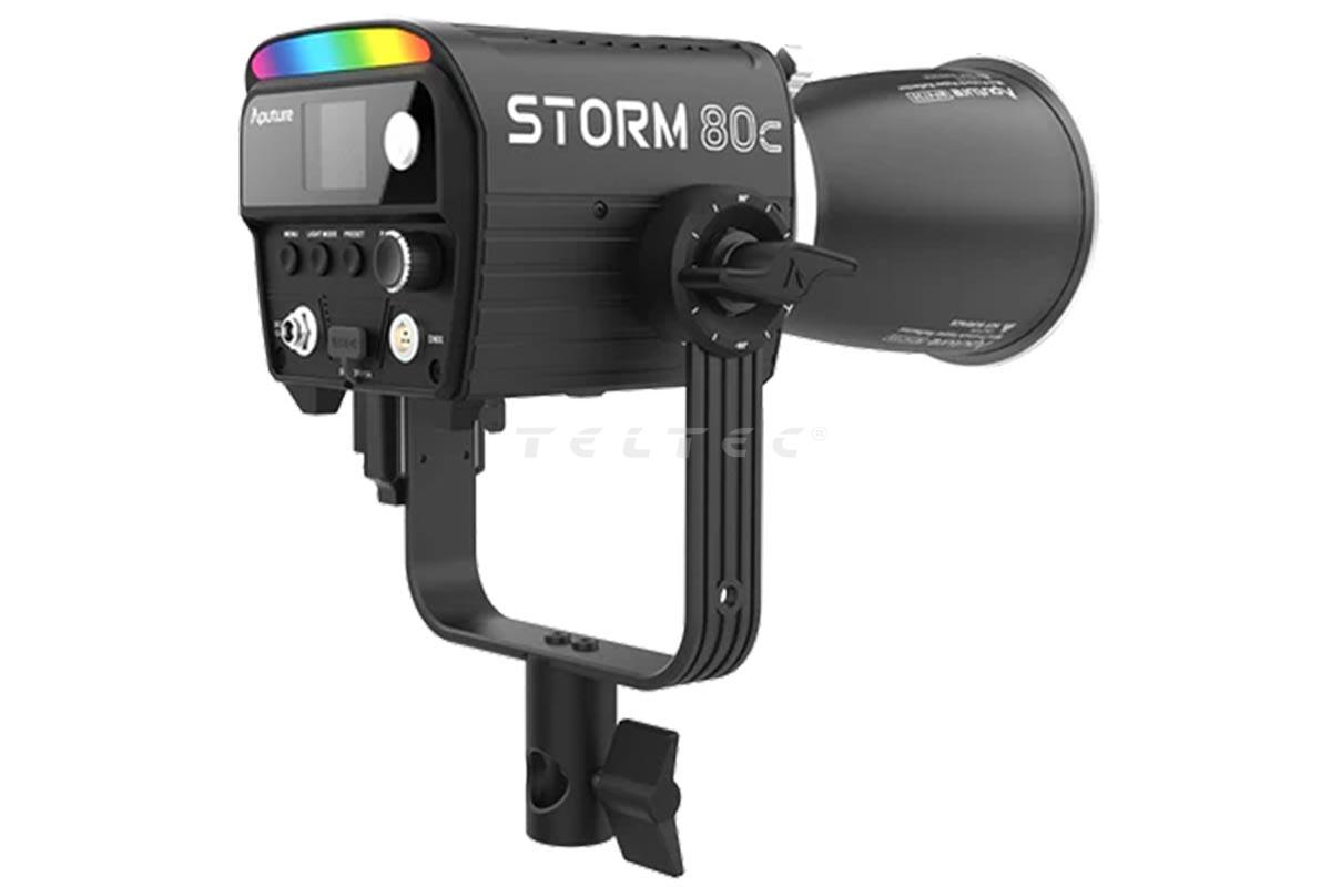 Die Aputure STORM 80c ist eine kompakte 80-W-Lampe mit variabler Farbeinstellung und ist mit der neuen BLAIR-CG-Light-Engine (Blue/Lime/Amber/Indigo/Red/Cyan/Green) ausgestattet, die ein größeres Farbspektrum bietet als jeder andere professionelle LED-Scheinwerfer auf dem Markt. Der Mini ProLock ist eine kleine Version des ProLock Bowens Mount mit Arretierung von Aputure. Er hält die Modifier fest an ihrem Platz und sorgt für eine korrekte Ausrichtung der Optik. Die Lampe kann über AC-Netzteil, V-Mount-Batterien oder USB-C mit Strom versorgt werden.