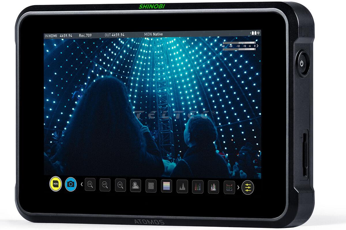Der Atomos Shinobi 7 ist ein 7" HDR-Touchscreen-Monitor mit einer Auflösung von 1920 x 1200 (16:10) und einer Helligkeit von 2200 nits. Der Monitor verfügt über HDMI Ein- und Ausgänge die Videosignale bis 4K DCI p60 unterstützen, sowie 3G-SDI Ein- und Ausgänge die Videosignale bis 2K DCI p60 unterstützen. Eine Cross-Konvertierung zwischen HDMI und SDI mit Down-Konvertierung ist ebenfalls im Atomos Shinobi 7 integriert. Mit optionalen Steuerkabeln lassen sich Kameras wie die Z-Cam E2 per Touchscreen das Menü steuern. Die Stromversorgung des 7" Monitors kann über zwei NP-F L-Serie Akkus (swap-fähig für durchgängige Stromversorgung) oder über Netzanschluss erfolgen. Mit AtomOS und AtomHDR bietet der Shinobi 7 vielfältige Tools wie Waveform, RGB, Histogramm, Focus Peaking oder 10+ Blendenstufen Dynamikumfang in Echtzeit von Log/PQ/HLG Signalen.
