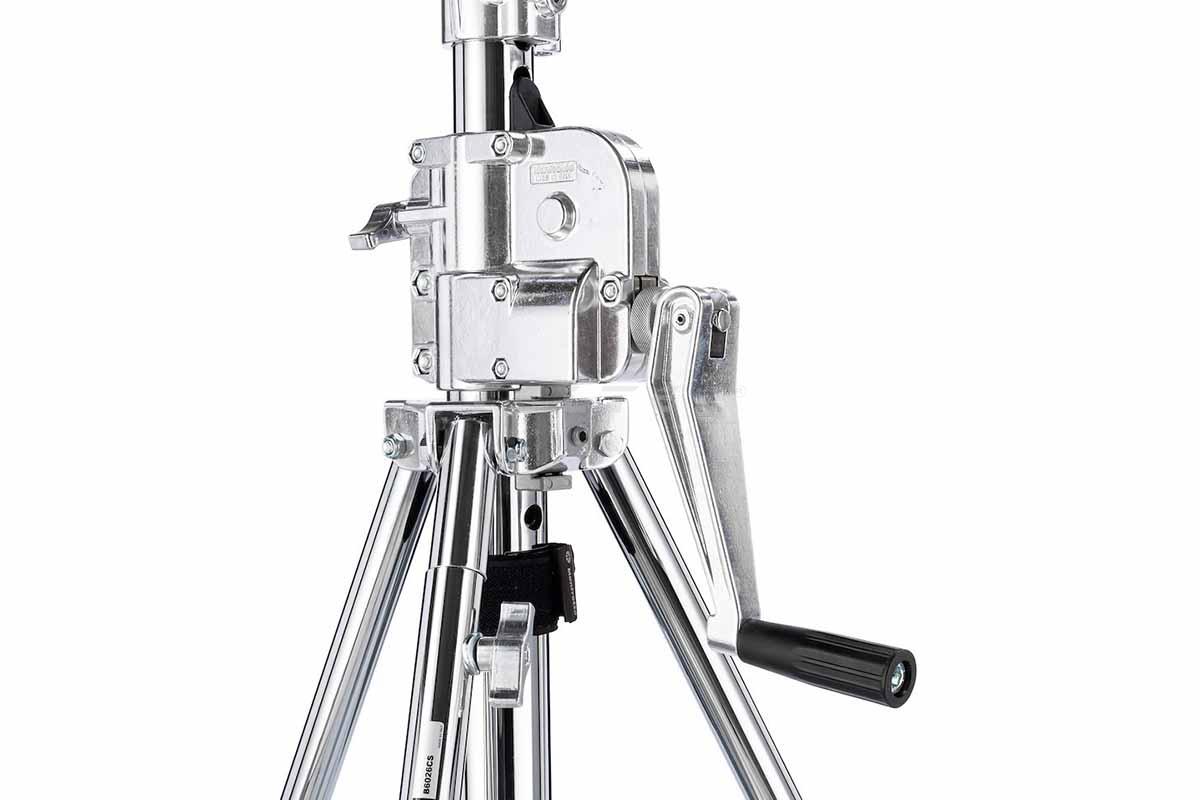 Das Avenger B6026CS Wind Up Stativ CS 2,6m m. Rollen ist ein aus Chromstahl gefertigtes Stativ und trägt mit seinen zwei Segmenten und einem Steigrohr Lasten von bis zu 45 kg. Die maximale Höhe des Wind Up Stand 39 beträgt 261 cm. Der Kombikopf mit einem 28 mm /1 1/8 Zoll Empfänger und einem 16 mm / 5/8 Zoll einziehbaren Baby Spigot bietet universelle Anschlussmöglichkeiten für Lichter, Ausleger und Modifikatoren. Das Stativ bietet ein einzigartiges 4-Seil-System, das ein müheloses heben und senken bietet. Um Scheinwerfer einfacher positionieren zu können, ist das Wind Up Stativ mit Rollen ausgestattet.