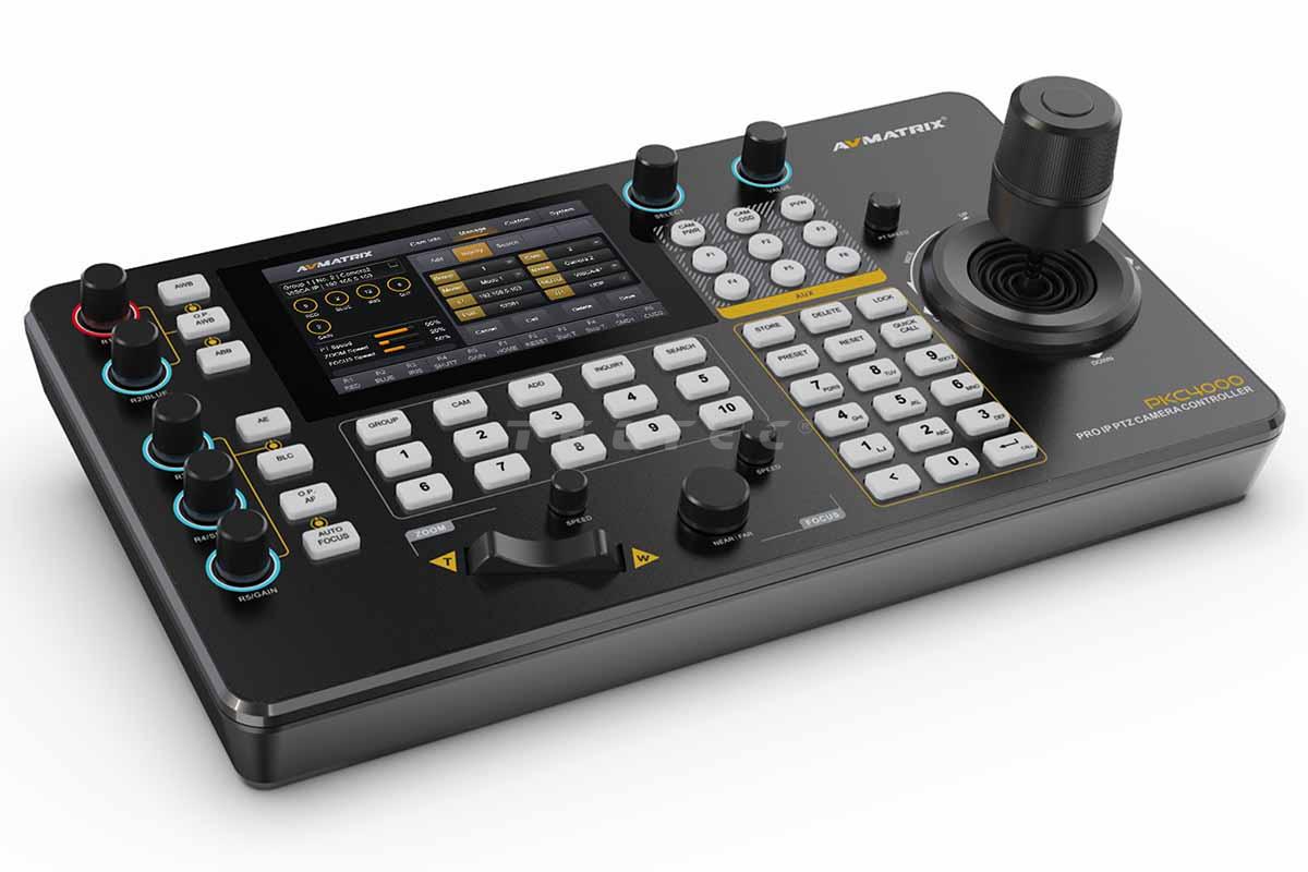 Der AVMatrix PKC4000 ist ein PTZ-Kamera-Controller, der mit einem 5" Touchscreen und einem 4D Joystick ausgestattet ist. Der Controller ermöglicht die Anbindung von bis zu 100 Kameras mit automatischer IP-Adresszuweisung und erlaubt die Steuerung von Schwenken, Neigen, Zoomen oder Fokussieren, wie auch vom Weißabgleich und der Belichtung. Dabei stehen die Protokolle: Visca, Visca Over IP, Pelco P&D und Onvif, über die IP-, RS-422-, RS-485- und RS-232-Schnittstelle zur Verfügung. Darüber hinaus ist der Controller in der Lage das Videosignal zu decodieren, sodass die Signalüberwachung mit einer äußerst geringen Latenz möglich ist. Außerdem sind 6 frei belegbare Tasten implementiert, die den schnellen Zugriff auf ausgewählte Funktionen bieten. Die Stromversorgung erfolgt über PoE oder per 12-V-DC-Netzteil.