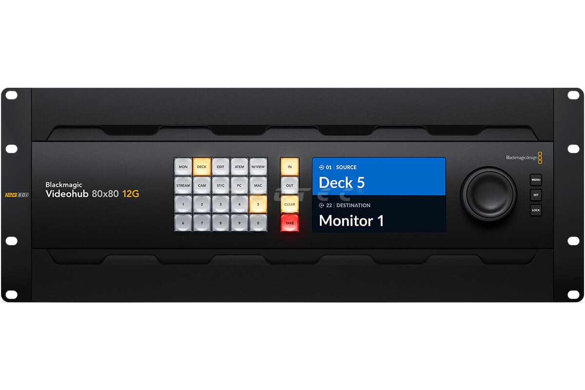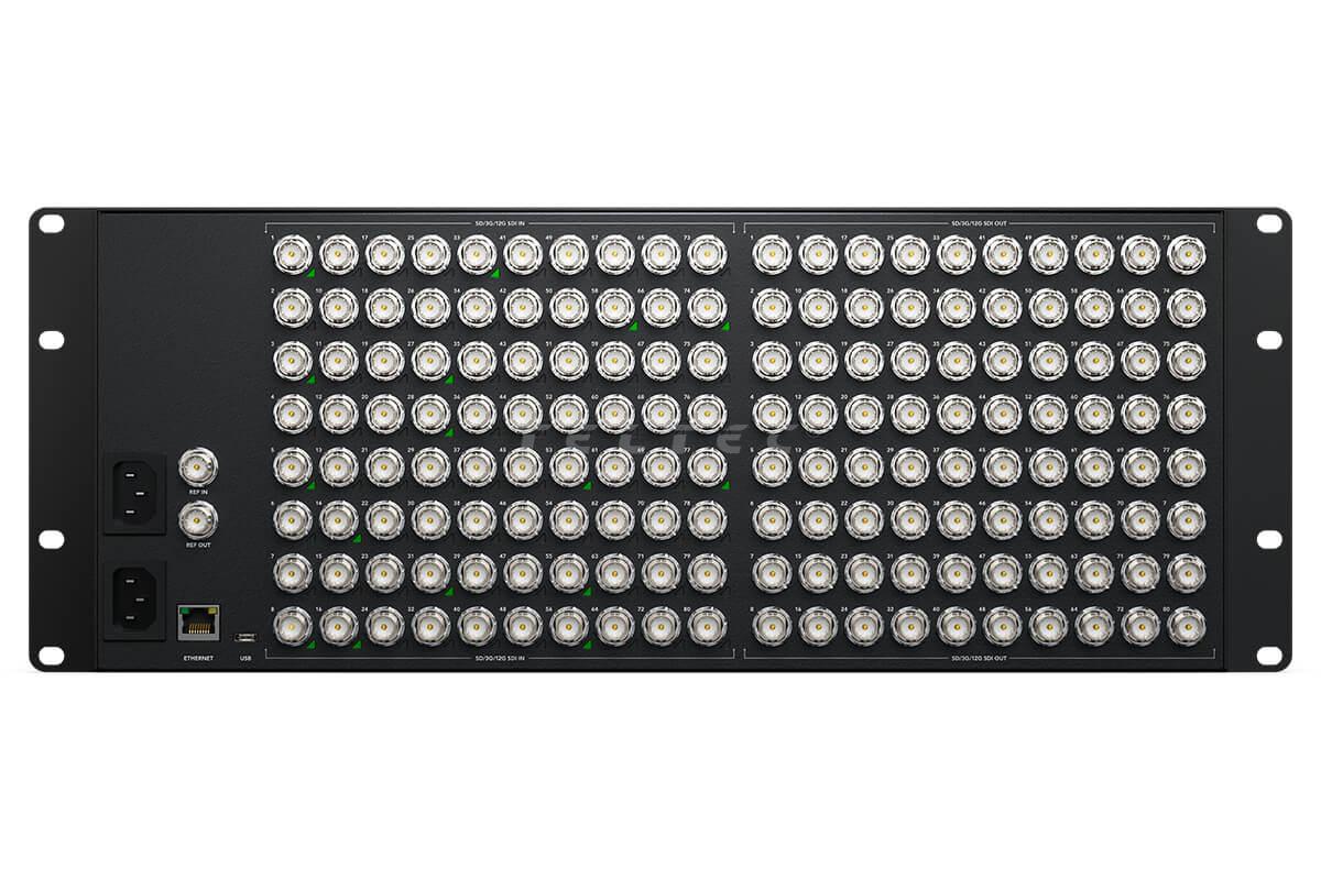 Die Blackmagic Design Videohub 80x80 12G ist eine extragroße latenzfreie 12G-SDI-Kreuzschiene für 80 x 80 Ein- und Ausgaben von beliebig kombinierten SD-, HD- und UHD-Videosignalen, gleichzeitig auf dem selben Gerät. Die Videohub 80 x 80 12G verfügt über ein 5" FullHD-Display zur Ansicht und für die Video- und Menüeinstellung. Die Frontblende bietet ein 24 Taasten Bedienfeld zur lokalen Steuerung, über Ethernet lässt sich die Kreuzschiene auch mit externer Softwaresteuerung bedienen. Das Routing kann durch direkte Tastenauswahl und über den großen Drehknopf mit elektronischer Kupplung erfolgen. Der Blackmagic Design Videohub 80x80 12G bietet außerdem SDI-Reclocking und unterstützt alle SDI-Videostandards bis zu 2160p60.