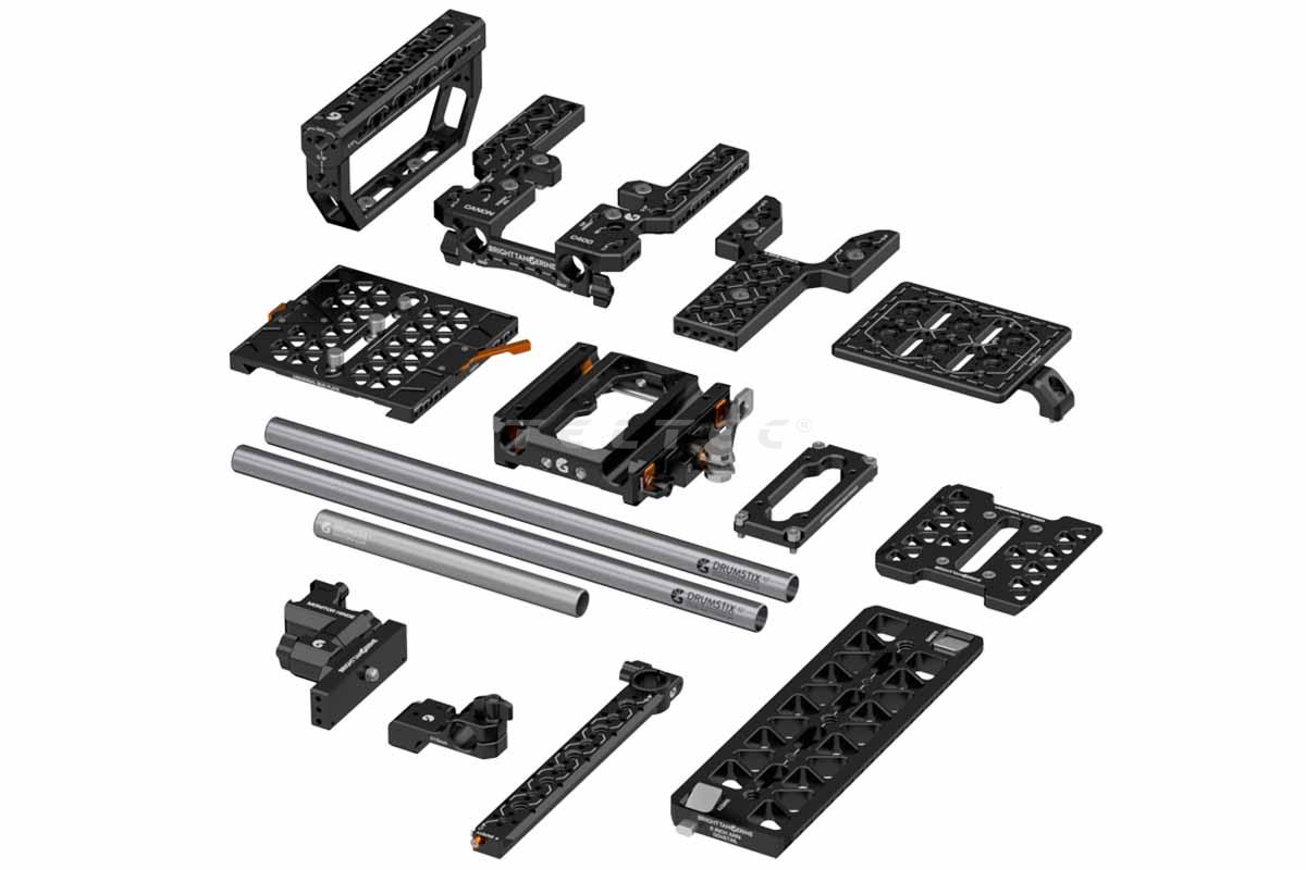 Das Bright Tangerine B4005.0044 LeftField 3 Canon C400 - Advanced Kit beinhaltet: ein D-Style Master Handle, eine Canon C400 Top Plate und ein Filler Piece, eine Cheese Plate und einen Cheese Plate Adapter (1/4"-20), eine 15-mm-Rod-Halterung sowie eine 15mm-NATO -Schiene, ein NATO Monitorgelenk, ein 15-mm-Rod mit 15,2 cm Länge, eine Universal BUD Plate, ein LeftField 3 Universal BUD Riser, ein LeftField 3 BUD Spacer (Canon), eine LeftField 3 15mm LWS QR Baseplate Core sowie zwei 15-mm-Rods mit 30,4 cm Länge und einer Create ARRI Standard Dovetail (8") Plate. Das Bright Tangerine B4003.1049 D-Style Master Handle ist ein ergonomischer Griff mit zahlreichen Erweiterungsmöglichkeiten, wie Pin-Lock Gewinde und QD-Buchsen. Die modular aufgebaute Bright Tangerine B4005.1030 Canon C400 Top Plate dient zur Befestigung von Zubehör an der Canon C400 Kamera. Dafür stehen mehrere 1/4"- und 3/8"-Gewinde, QD-Buchsen und eine 15-mm-Halterungen zu Verfügung. Mit dem Top Plate Filler Piece wird eine flache Oberfläche erreicht, sodass Handgriffe oder Gimbals befestigt werden können. Zur Befestigung von weiterem Zubehör ist eine Cheese Plate enthalten, die über ARRI-Standard 1/4"- und 3/8"-Gewinde mit Verdrehsicherung verfügt. Der Cheese Plate Adapter bietet dabei zusätzlichen Abstand zwischen der Kamera und der Cheeseplate und verfügt zudem über einen 90° Versatz, um drahtlose Sender, Timecode-Geräte oder Audiorecorder zu platzieren. Weiterhein umfasst das Kit eine 15-mm-Stangenhalterung, welche die Stange mit einer Flügelklemme fixiert, einer NATO-Schiene mit einem Bewegungsbereich von 140 mm sowie einer 15-mm-Stange mit M12-Gewinde und einer Länge von 15,2 cm. Mittels 2-achsigem Monitorgelenk kann der Canon-LCD-Monitor an der NATO-Schiene befestigt werden. Die Universal BUD Plate ermöglicht den nahtlosen Wechsel zwischen Schulter-Rig, Basisplatte, Gimbal und Handheld-Konfigurationen. Der BUD Riser dient dazu die Kamera auf eine Standardhöhe einzustellen. Der Riser Spacer ist wiederum ein Abstandshalter, um den B4003.1036 - Universal BUD Riser an der B4003.1034 - LeftField 3 15mm LWS Baseplate zu befestigen. Eine Basisplatte mit Schnellverschluss und 15-mm-Rod-Support ist ebenso enthalten, wie auch eine Schwalbenschwanzplatte, die nahtlos in jede ARRI-Standard-Dovetail-Klemme oder Baseplate integriert werden kann.