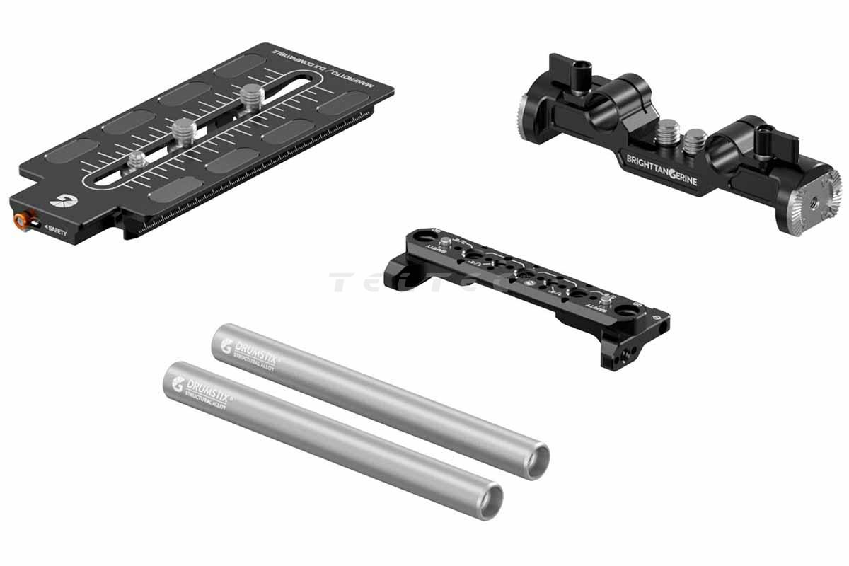 Das Bright Tangerine B4009.0001 Fujifilm GFX ETERNA Base Kit ist ein leichter, niedrig bauender Kamerakäfig für Filmemacher, die schnell zwischen Gimbal-, Stativ- und Handheld-Setups wechseln möchten. Das Kit basiert auf dem Universal Dovetail-Ökosystem und ermöglicht den nahtlosen Wechsel zwischen DJI-Gimbals und Manfrotto-Stativen, ohne Teile des Rigs umzubauen. Für Handaufnahmen bietet das Set zwei ARRI-Rosetten zur Montage kompatibler Handgriffe. Die vordere 15-mm-LWS-Abstützung positioniert Zubehör wie Matteboxen normgerecht. Oben sorgt die NATO Top Plate mit 1/4"- und 3/8"-Anti-Twist-Punkten, QD-Sockets und integrierter NATO-Schiene für zusätzliche Rigging-Optionen.