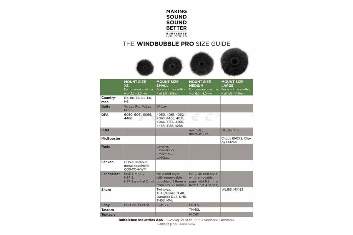 Der Windbubble PRO ist eine Weiterentwicklung des beliebten Standard Windbubbles von der dänischen Firma BUBBLEBEE INDUSTRIES. Der Windbubble PRO basiert auf einer weichen Gummifassung, in der das Lavalier-Mikrofon Halt findet und einem speziellen Fell, welches aus zwei Haarlängen besteht. Die spezielle Gummihalterung für das Lavaliermikrofon absorbiert Stöße und verhindert die Übertragung von Vibrationen auf die Mikrofonkapsel. Außerdem ist die Gummifassung innen so geformt, dass das Mikrofon nicht zu weit in den Windschutz hineingedrückt werden kann. Dadurch ist im Windbubble PRO um die Kapsel immer eine "Luftblase" aus ruhender Luft, die das Mikrofon vor Windgeräuschen schützt und einen transparenten Klang ermöglicht. Das umgebende Fell mit verschiedenen Haarlängen wurde speziell entwickelt, um die energetischen Luftpartikel allmählich abzubremsen, bevor sie das Mikrofon erreichen. Die Basis des Fells hat eine höhere Dichte an kürzeren Haaren und ein akustisch transparentes Trägermaterial für maximale Klangtransparenz.
