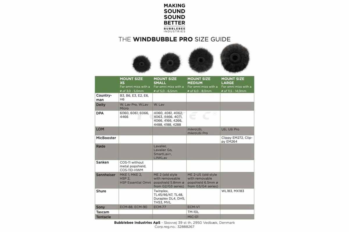Der Windbubble PRO ist eine Weiterentwicklung des beliebten Standard Windbubbles von der dänischen Firma BUBBLEBEE INDUSTRIES. Der Windbubble PRO basiert auf einer weichen Gummifassung, in der das Lavalier-Mikrofon Halt findet und einem speziellen Fell, welches aus zwei Haarlängen besteht. Die spezielle Gummihalterung für das Lavaliermikrofon absorbiert Stöße und verhindert die Übertragung von Vibrationen auf die Mikrofonkapsel. Außerdem ist die Gummifassung innen so geformt, dass das Mikrofon nicht zu weit in den Windschutz hineingedrückt werden kann. Dadurch ist im Windbubble PRO um die Kapsel immer eine "Luftblase" aus ruhender Luft, die das Mikrofon vor Windgeräuschen schützt und einen transparenten Klang ermöglicht. Das umgebende Fell mit verschiedenen Haarlängen wurde speziell entwickelt, um die energetischen Luftpartikel allmählich abzubremsen, bevor sie das Mikrofon erreichen. Die Basis des Fells hat eine höhere Dichte an kürzeren Haaren und ein akustisch transparentes Trägermaterial für maximale Klangtransparenz.