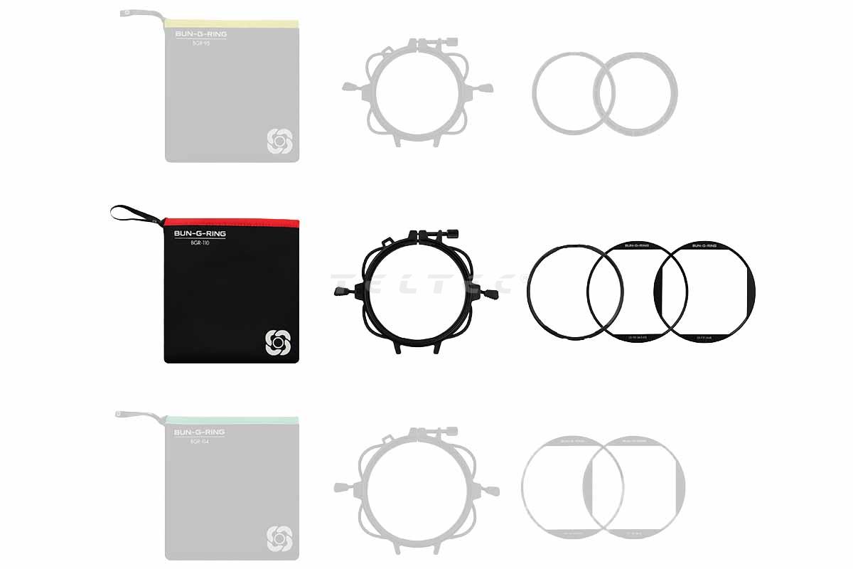 Der Bun-G-Ring Single (BGR-110) befestigt Filter mithilfe eines Dyneema verstärkten Bungee-Seils in Kombination mit einem zuverlässigen Klemmsystem sicher am Objektiv. Dieses Einzelstück enthält ein farbcodiertes BGR-110, zwei Lichtabschirmende Einsätze, in den Größen 4x4" und 4x5,65", sowie einen Step-Down-Ring, von 110-auf-104mm und eine Neoprenhülle zur Aufbewahrung von einem Bun-G-Ring + 4x5.65" Filter.