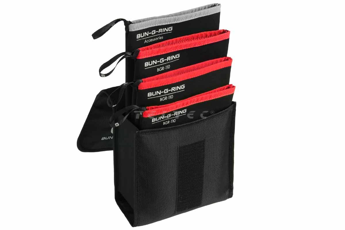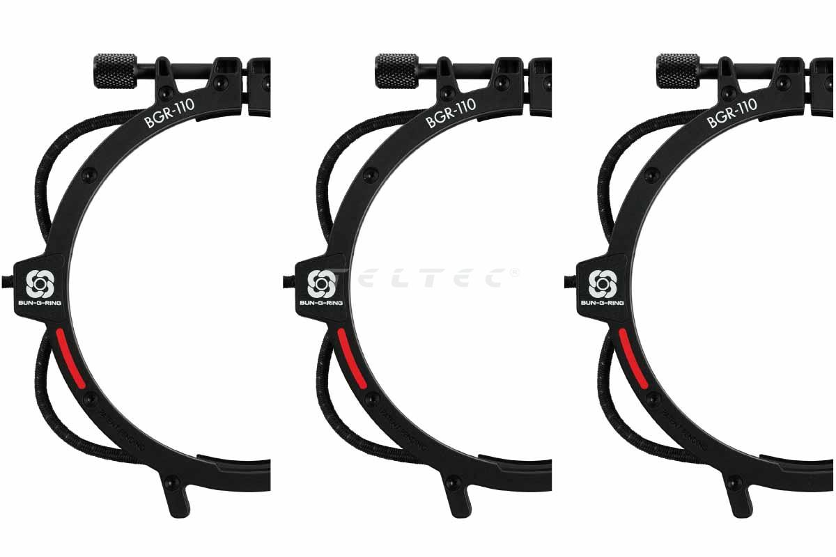 Das Bun-G-Ring Triple Kit (BGR-110) ist ein 3er-Set Filterhalterungen mit Bungee-Seil-System. Ein Bun-G-Ring kann auf ein Objektiv entsprechender Größe montiert werden, um dann Filter aufnehmen und mittels Bungee-Seil an allen Ecken zu sichern. Dieses Kit beinhaltet drei dieser Ringaufsätze für 110-mm-Objektive, drei Größenadapter 110-auf-104 mm und je drei Lichtschutzeinschübe für 4x4"- bzw. 4x5.65"-Filter. Zusätzlich dazu sind noch Hüllen und eine Tasche im Paket enthalten - drei Hüllen mit rotem Farbcode und ein Beutel, der alle bestückten Hüllen aufnehmen kann und zusätzlichen Schutz sowie einen einfacheren Transport bietet.