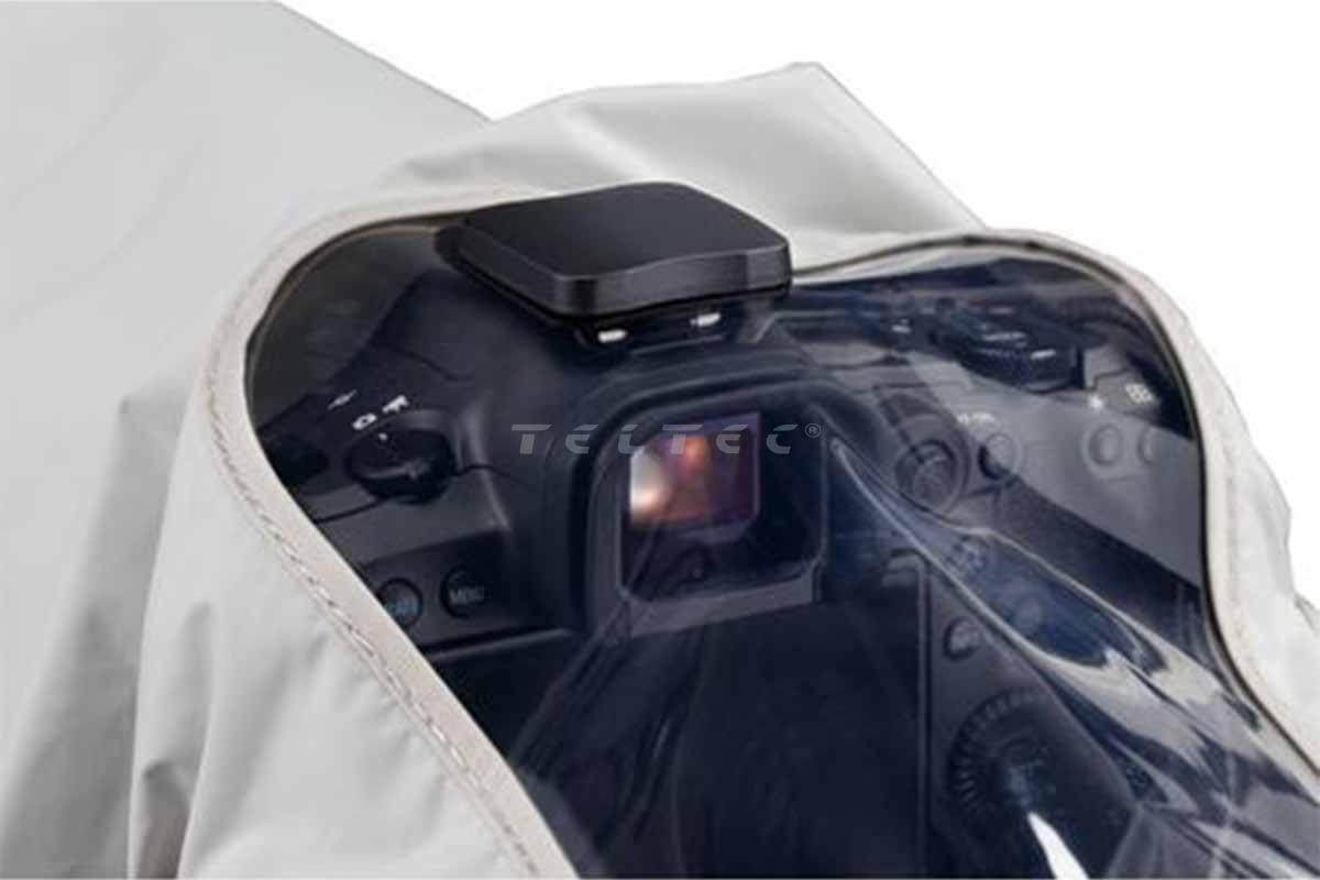 Der Canon ERC-R5S Kamera-Regenschutz Small ist eine Regenschutzhülle für Kameras, wie die Canon EOS R1, mit der Größe S, sodass auch kürzere Objektive geschützt werden.