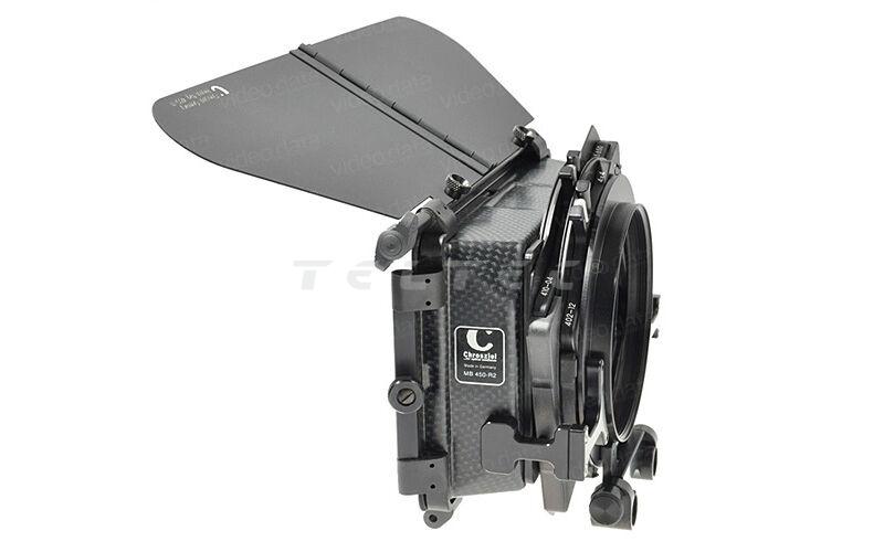 Das Chrosziel 450R2-DSLR2KIT enthält eine Mattebox, eine Leichtstütze mit 15 mm Rohren und eine komplette Schärfezieheinrichtung. Durch die mitgelieferten Lichtabschlussringe lässt sich die Mattebox unterschiedlichen Objektivdurchmessern anpassen.