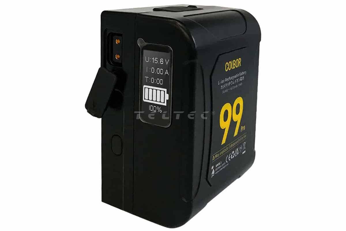 Der COLBOR Power 99 PRO V-Mount-Akku mit OLED-Bildschirm bietet maximale Leistung in einem tragbaren, flugzeugtauglichen Formfaktor und kann eine 100-W-Lampe über seine V-Mount-Platte oder zwei D-Tap-Schnittstellen bis zu 1,5 Stunden lang aufladen. Die maximale Ausgangsleistung des Akkus von 200 W und 15 A reicht aus, um Monitore, Kameras, Leuchten und andere Geräte zu betreiben. Die USB-C- und D-Tap-Anschlüsse können auch zum Aufladen des Akkus verwendet werden, wobei der USB-C-Anschluss auch 65 W Schnellladung unterstützt. Der USB-A-Anschluss lädt kleine tragbare elektronische Geräte mit maximal 5 V und 2,1 A auf.