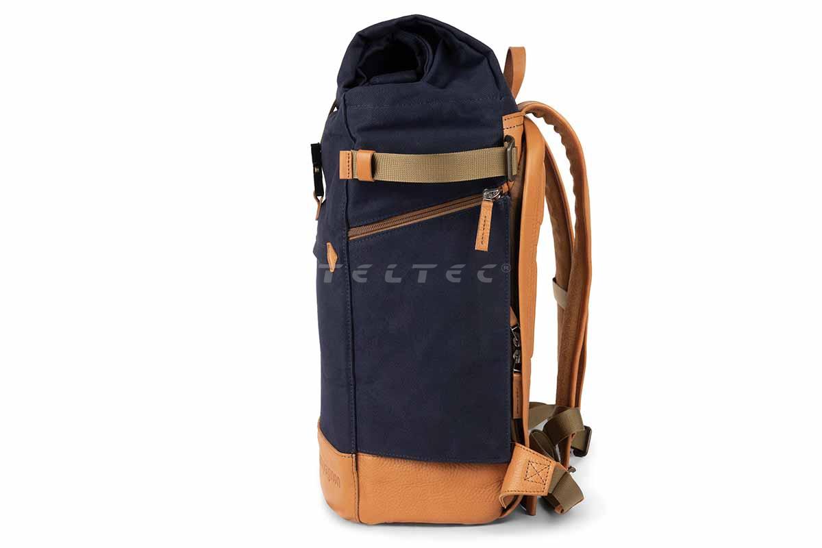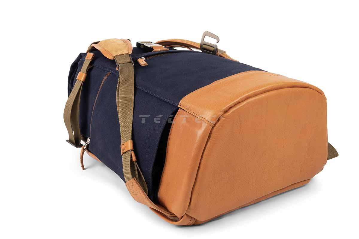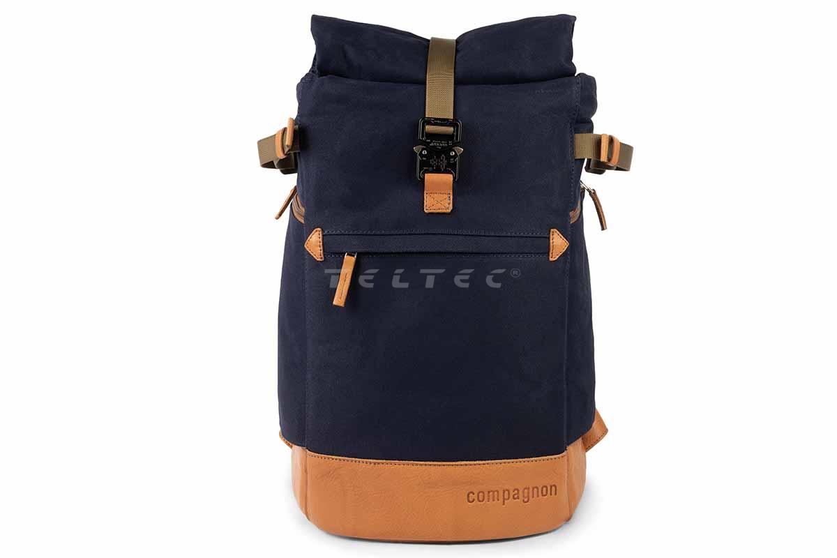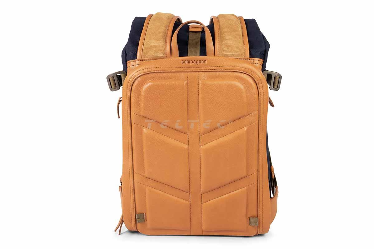 Der Compagnon backpack Gen III (Blau/Hellbraun) ist ein robuster und geräumiger Kamerarucksack mit Rolltop. Während der Rucksack an sich ein Volumen von 24 Litern besitzt, erweitert das Rolltop dieses Volumen um weitere 8 Liter. Es lässt sich per Magnet sicher verschließen, bei Bedarf aber auch schnell öffnen. Die Schultergurte bieten eine breite Auflagefläche, die gut gepolstert und schön geformt ist. Zusammen mit dem Brustgurt wird für einen idealen Sitz gesorgt. An den Seiten gibt es jeweils einen Köcher für z.B. Trinkflaschen und Stative, welche dann mittels Militärnylongurte mit Alu-Haken fixiert werden können. Front und Boden des Rucksacks sind verstärkt, um die Form zu behalten und besser stehen zu können. Das lederne Rückenpanel ist mit einer bequemen Schaumstoffpolsterung unterlegt, um zum Tragekomfort beizutragen. Damit es nicht zu Wärme- und Feuchtigkeitsstaus kommt, sind Belüftungskanäle eingearbeitet. Vorne bietet der Rucksack eine schmale Einschubtasche für kleinere Gegenstände, das Hauptfach allerdings ist nur über die Rückseite oder das Rolltop zu erreichen. Dort gibt es auch ein 15"-Laptop-Fach, das über einen Reißverschlusszugang erreichbar ist, ohne den Rucksack komplett öffnen zu müssen. Im Rolltop-Staubereich gibt es einen herausnehmbaren Klettboden, falls mehr Platz im Hauptfach benötigt wird. Ansonsten trennt er die beiden Stauräume optimal voneinander. Das Hauptfach ist rundum gepolstert und mit insgesamt 14 Klettpolstern individuell anpassbar. Zwei davon sind besonders lang und faltbar. Für zusätzliche Sicherung der Ausrüstung gibt es 8 klettbare Leder-Fixierbänder. Eine innenliegende Reißverschlusstasche im Rolltop ist ideal für wichtige Dokumente und Bargeld geeignet. Außerdem gibt es noch drei zusätzliche Mesh-Taschen mit Reißverschluss, die mittels Klett frei im Stauraum platziert werden können.