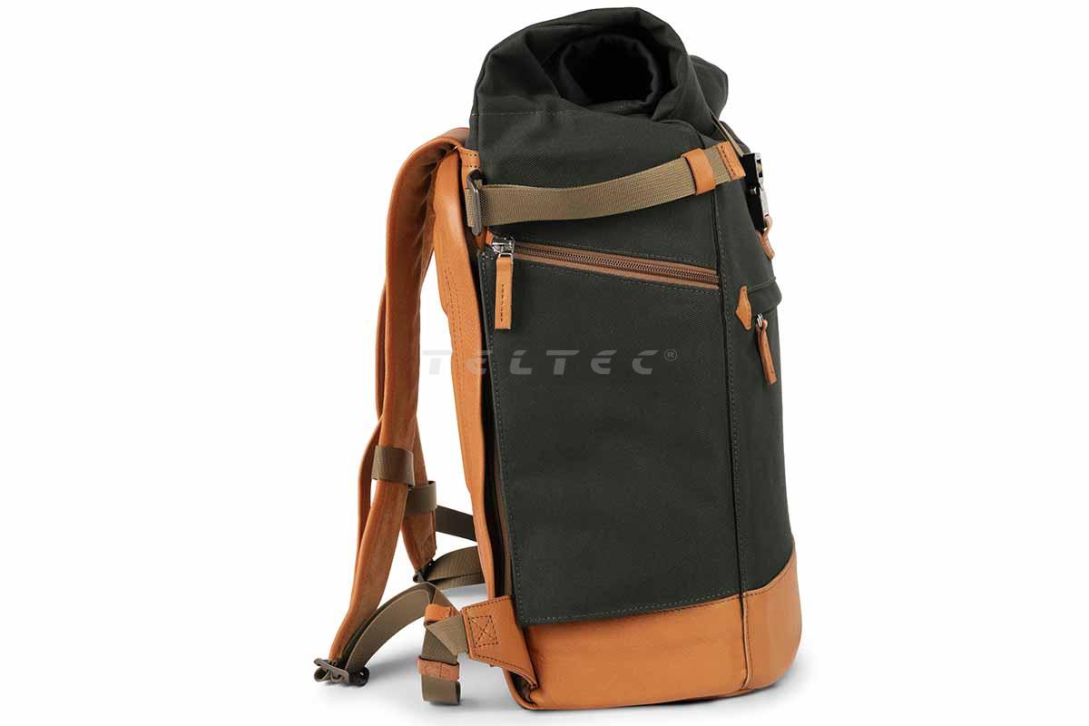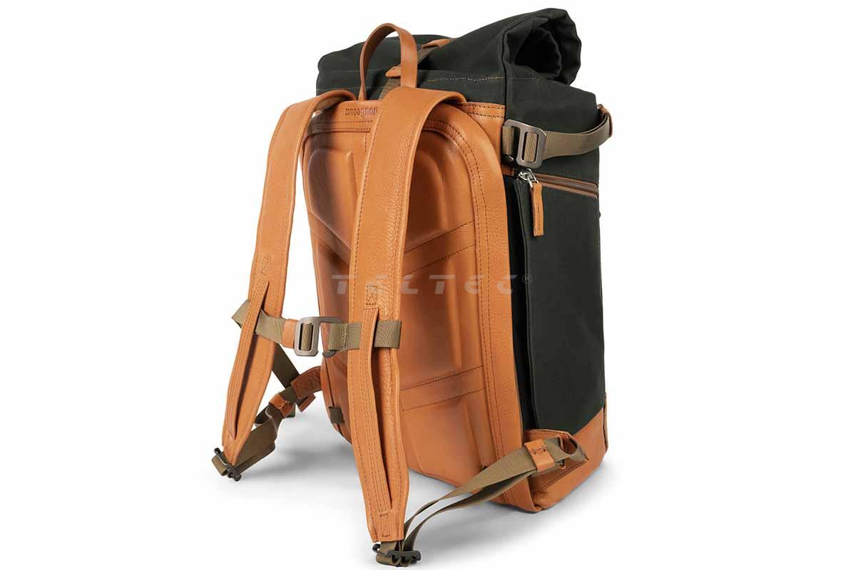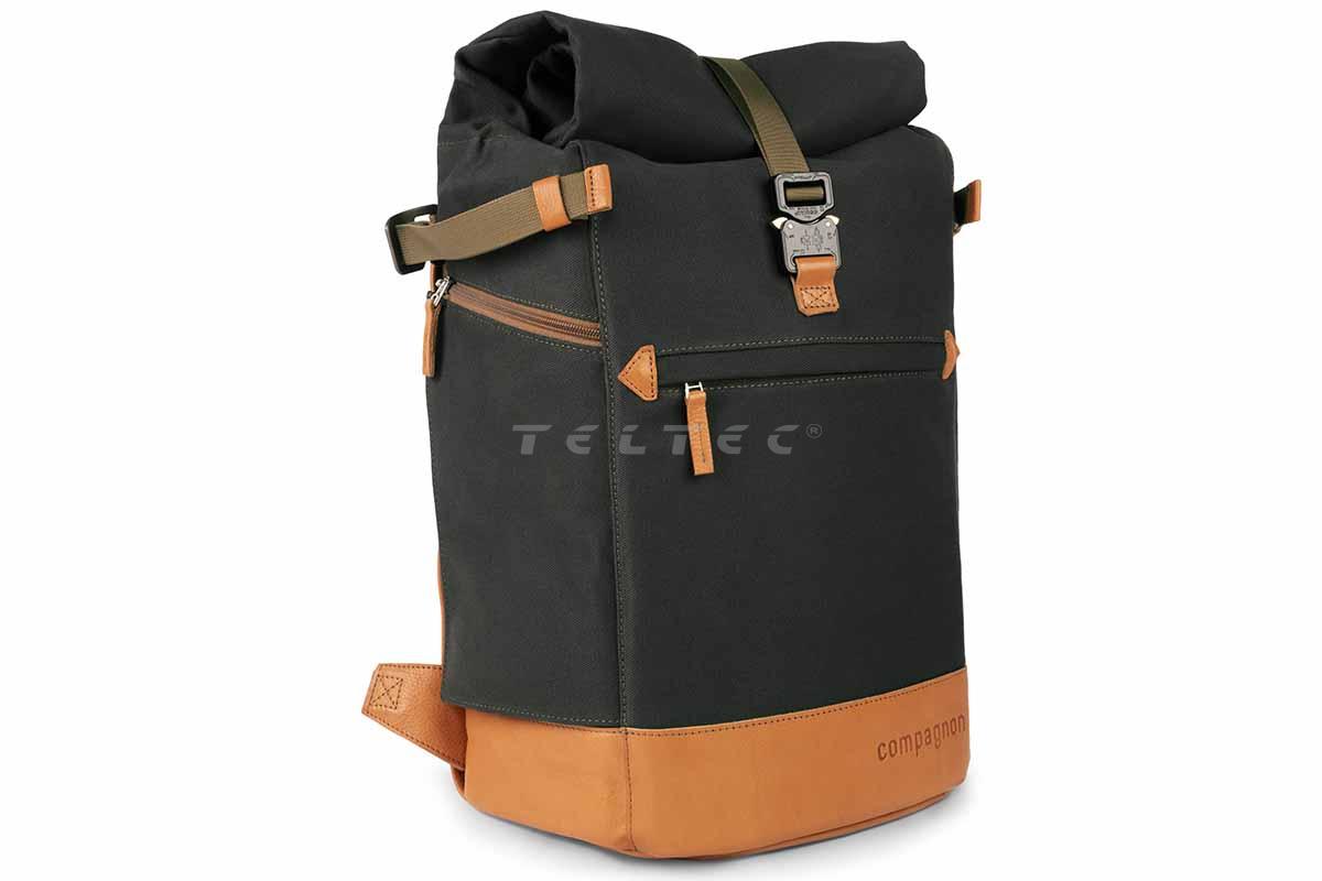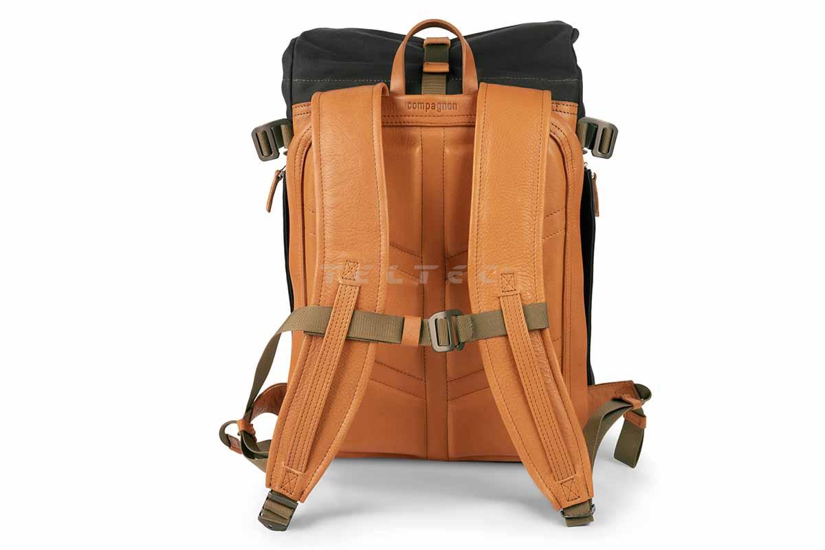 Der Compagnon backpack Gen III (Grün/Hellbraun) ist ein robuster und geräumiger Kamerarucksack mit Rolltop. Während der Rucksack an sich ein Volumen von 24 Litern besitzt, erweitert das Rolltop dieses Volumen um weitere 8 Liter. Es lässt sich per Magnet sicher verschließen, bei Bedarf aber auch schnell öffnen. Die Schultergurte bieten eine breite Auflagefläche, die gut gepolstert und schön geformt ist. Zusammen mit dem Brustgurt wird für einen idealen Sitz gesorgt. An den Seiten gibt es jeweils einen Köcher für z.B. Trinkflaschen und Stative, welche dann mittels Militärnylongurte mit Alu-Haken fixiert werden können. Front und Boden des Rucksacks sind verstärkt, um die Form zu behalten und besser stehen zu können. Das lederne Rückenpanel ist mit einer bequemen Schaumstoffpolsterung unterlegt, um zum Tragekomfort beizutragen. Damit es nicht zu Wärme- und Feuchtigkeitsstaus kommt, sind Belüftungskanäle eingearbeitet. Vorne bietet der Rucksack eine schmale Einschubtasche für kleinere Gegenstände, das Hauptfach allerdings ist nur über die Rückseite oder das Rolltop zu erreichen. Dort gibt es auch ein 15"-Laptop-Fach, das über einen Reißverschlusszugang erreichbar ist, ohne den Rucksack komplett öffnen zu müssen. Im Rolltop-Staubereich gibt es einen herausnehmbaren Klettboden, falls mehr Platz im Hauptfach benötigt wird. Ansonsten trennt er die beiden Stauräume optimal voneinander. Das Hauptfach ist rundum gepolstert und mit insgesamt 14 Klettpolstern individuell anpassbar. Zwei davon sind besonders lang und faltbar. Für zusätzliche Sicherung der Ausrüstung gibt es 8 klettbare Leder-Fixierbänder. Eine innenliegende Reißverschlusstasche im Rolltop ist ideal für wichtige Dokumente und Bargeld geeignet. Außerdem gibt es noch drei zusätzliche Mesh-Taschen mit Reißverschluss, die mittels Klett frei im Stauraum platziert werden können.