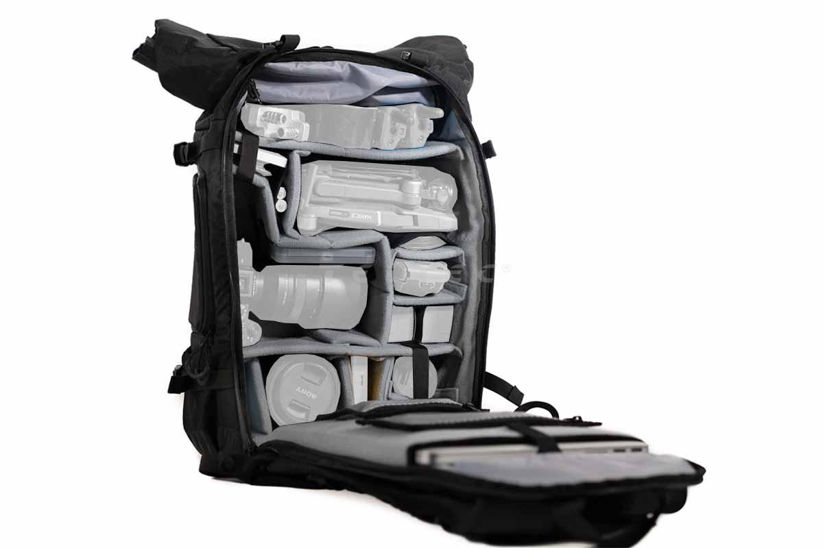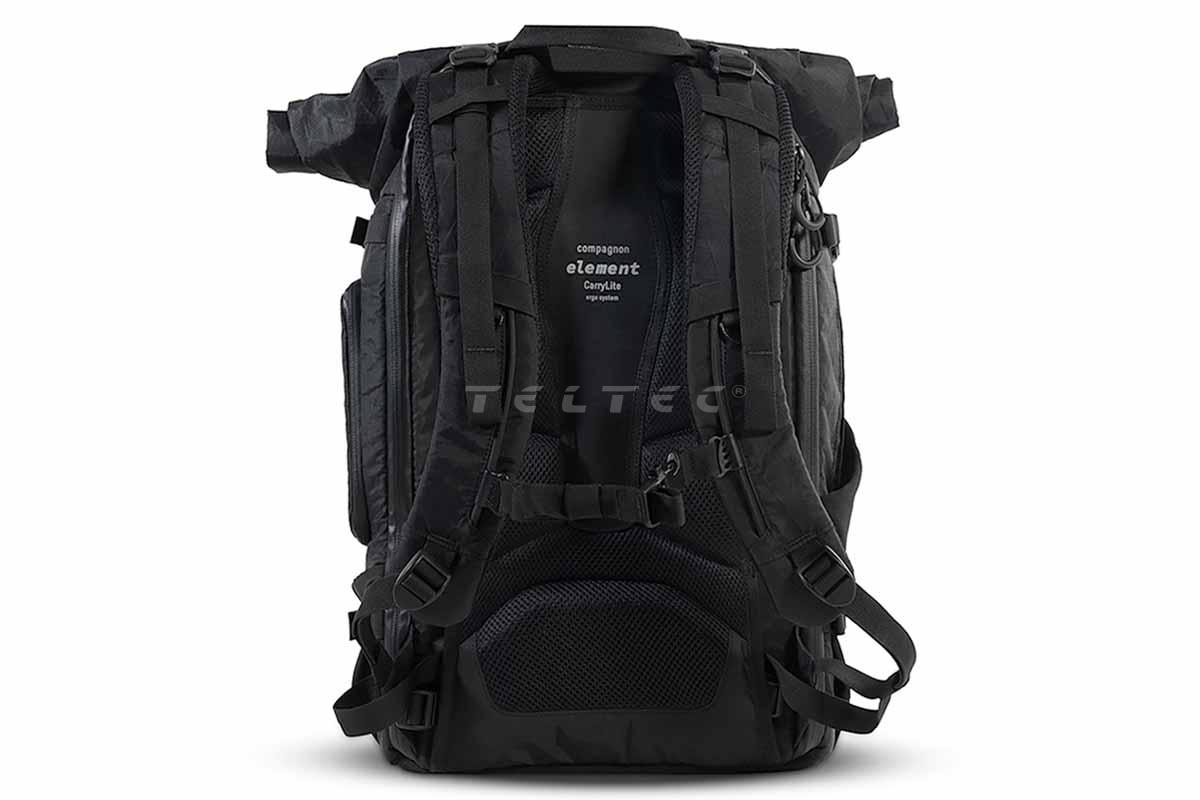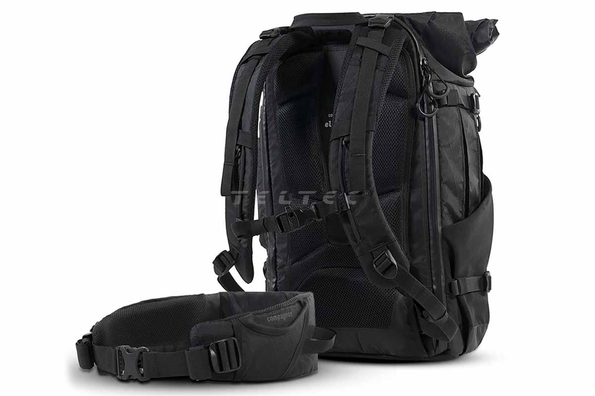 Der Compagnon Element Backpack 30L Volcano Black ist ein robuster Outdoor-, Reise- und Kamerarucksack mit 30 Liter Volumen. Sein stark wasserabweisendes Äußeres schützt den Inhalt vor Nässe und Schmutz. Es besteht aus einem mehrschichtigen Segeltuchmaterial mit extrem starkem Gewebe und hält daher auch enorme Belastungen aus. Das Rolltop, welches zusätzliches Volumen bietet, ist einerseits mit einer optionalen Klettklappe mit Silencer-Funktion, andererseits mit einem magnetischen Verschluss versehen, der sich leicht und schnell öffnen, aber auch sicher schließen lässt. Mehrere Seiteneinschübe erlauben das Verstauen von Wasserflaschen, Stativen und Gimbals in verschiedenen Größen. Fixiergurte helfen dabei, die Gegenstände organisiert zu halten. Außerdem verfügen die ebenfalls seitlichen Schnellzugriffe sowie die Fronttasche über Karabinerhaken, welche die Reißverschlüsse sichern und unerlaubten Zugriff verhindern können. Für Tragekomfort sorgen das CarryLite ergo Tragesystem, das mit 3D AirMesh Polsterung aufwartet, sowie ErgoBelt Hüftflossen und Hüftgurt, die die Schultern und den Rücken entlasten und schonen. Im Taschenboden befindet sich ein verstecktes Fach für den Überwurf, der (ohne Rucksack) leicht unter Wasser gereinigt werden kann. Außerdem gibt es am Boden noch eine Schlaufe, in die ein Licht eingehängt werden kann. Das rundherum gepolsterte Hauptfach kann mit insgesamt 10 Klettpolstern individuell angepasst werden. Die drei großen Polster (1x L, 2x M) haben zudem eine Faltfunktion, drei der kleinen verfügen über Flex-Einschübe für kleines Zubehör wie Filter, Akkus oder Batterien. Zusätzlich zu den Klettpolstern gibt es ebenfalls 10 klettbare Fixierbänder, um kleine Teile oder besonders schweres Equipment zu sichern. Die Trennwand zwischen Rolltop und Hauptfach hat einen Reißverschluss, genauso wie die im Rolltop befindliche Tasche für z.B. Geldbeutel und Reisedokumente. Für weiteren Alltagsbedarf gibt es eine geräumige Fronttasche mit RV-Fach und Einschubtasche. Außerdem verfügt der Rucksack über ein gepolstertes Laptop-Fach für bis zu 15 Zoll große Geräte, welches sich erreichen lässt, ohne den Rucksack komplett öffnen zu müssen. Zusätzlich dazu gibt es hinter dem Laptop-Fach eine Isomatte und einen Speicherkartenhalter für mindestens 6 Karten sowie zwei zusätzliche Meshtaschen.