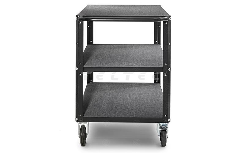 Dreistöckiger Rollwagen aus Stahl mit Rasterschaumstoff ausgelegten Ablageflächen