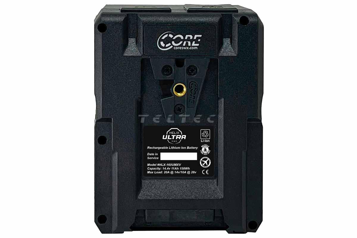 Der Core SWX Helix Max Ultra 160 V (HLX-160UMXV) ist ein leistungsstarker Li-Ion V-Mount Akku mit einer Kapazität von 158 Wh. Dank Dual-Voltage-Technologie liefert der Akku flexibel und je nach Anwendungsbedarf 14 V oder 24 V. USB-C und D-Tap Anschlüsse bietet eine zuverlässige Stromversorgung für Zubehörteile. Mit dem integrierten USB-C Port lässt sich der Akku auch ohne ein V-Mount Akkuladegerät laden. An der Seite ist ein Display angebracht sowie farbige LED-Indikatoren die den aktuellen Ladezustand anzeigen.