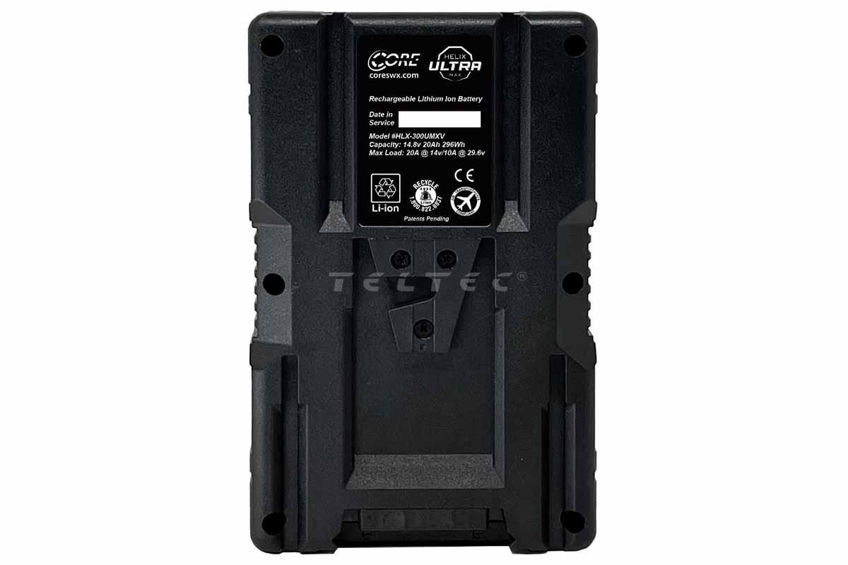 Der Core SWX Helix Max Ultra 300 V (HLX-300UMXV) ist ein leistungsstarker Li-Ion V-Mount Akku mit einer Kapazität von 297 Wh. Dank Dual-Voltage-Technologie liefert der Akku flexibel und je nach Anwendungsbedarf 14 V oder 24 V. USB-C und D-Tap Anschlüsse bietet eine zuverlässige Stromversorgung für Zubehörteile. Mit dem integrierten USB-C Port lässt sich der Akku auch ohne ein V-Mount Akkuladegerät laden. An der Seite ist ein Display angebracht sowie farbige LED-Indikatoren die den aktuellen Ladezustand anzeigen.