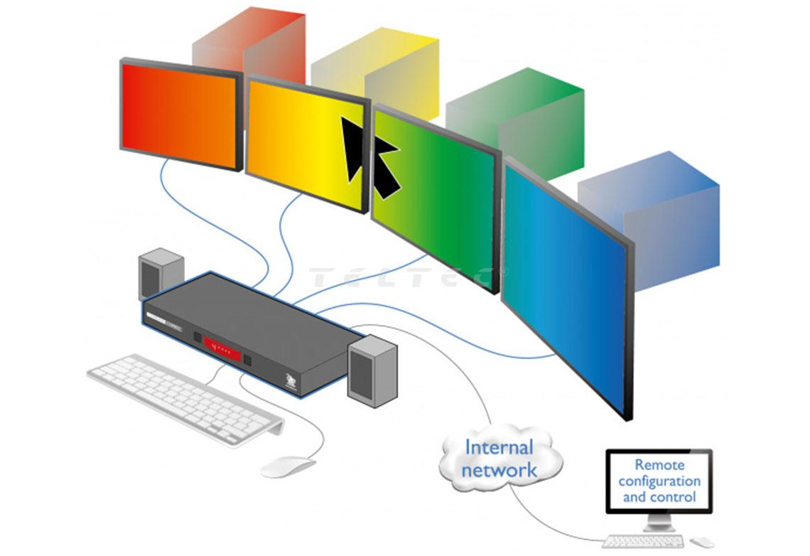 Der ADDER CCS-PRO4 ermöglicht es Benutzern, mit bis zu 4 Computern mit einer einzigen Maus zu interagieren. Der Bediener kann einfach den Cursor über die Bildschirmgrenzen bewegen, um sofort den Computer auszuwählen, den sie kontrollieren wollen.