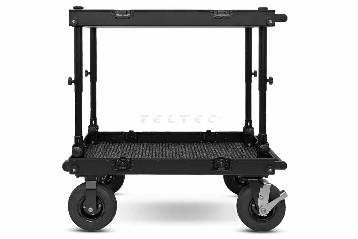 Der adicam STANDARD mit Höhenverstellsystem Black Edition ist ein professioneller Kamerawagen, der der gesamten Film- und Fernsehbranche gewidmet ist. Das doppelstöckige Film Cart ermöglicht den Transport von Geräten von bis zu 200 kg und ermöglicht das einfache Transportieren von Film- und Ton Equipment selbst in engen Umgebungen. Jede Ablage ist mit einer Abdeckung versehen, um ein Verschieben der darauf platzierten Geräte zu verhindern. Der gesamte Kamerawagen lässt sich leicht und kompakt zusammenfalten, für einen Platz sparenden Transport. Der Auf- und Abbau des Kamerawagens dauert ca. 2 Minuten und ist mühelos durchführbar. Der adicam STANDARD verfügt über 9″-Luftreifen mit zwei Bremsen. Die adicam Height Adjustable Legs (Standard Cart) sind höhenverstellbare Beine für den adicam Standard Wagen. Das Set besteht aus vier Beinen mit Befestigungsmaterial. Der Satz ermöglicht eine Anpassung der Höhe der obersten Ablage des Wagens im Bereich von 25 cm. Die Veränderung kann um eine Stufe (5 cm) nach oben oder um drei Stufen (15 cm) von der normalen Beinlänge nach unten erfolgen. Dieses Zubehör erfordert keine zusätzlichen Werkzeuge für die Einstellung. Die Beine bestehen aus Aluminium, was sie leicht, stabil und langlebig macht. Die Black Edition zeichnet sich durch die schwarzen Verschlüsse aus, die normalerweise silber sind.