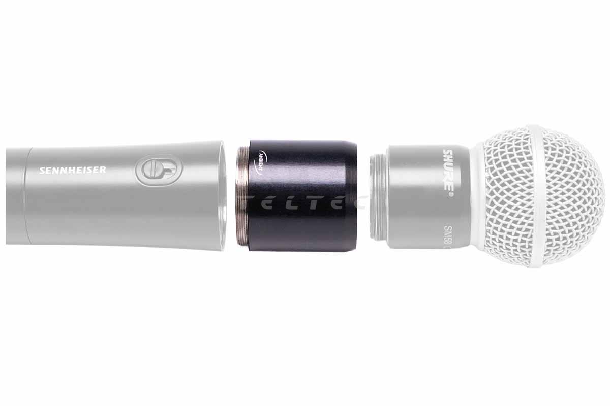 Der Ambient HHA-SH58 ist ein Hand Held Adapter, der zur Anpassung von Shure SM58-Kapseln an Sennheiser-Handmikrofonen dient. Der Adapter passt sich an die Form des Senders an und setzt diese bis zur Kapsel fort.