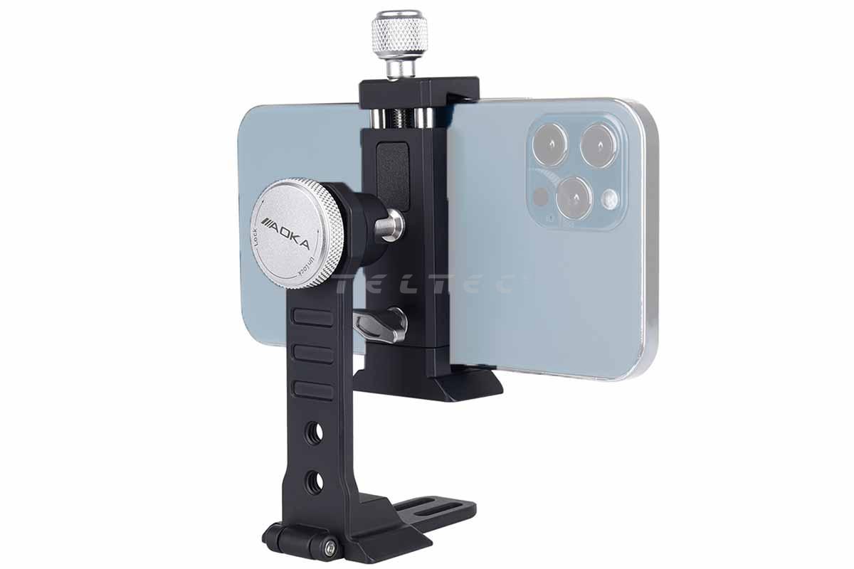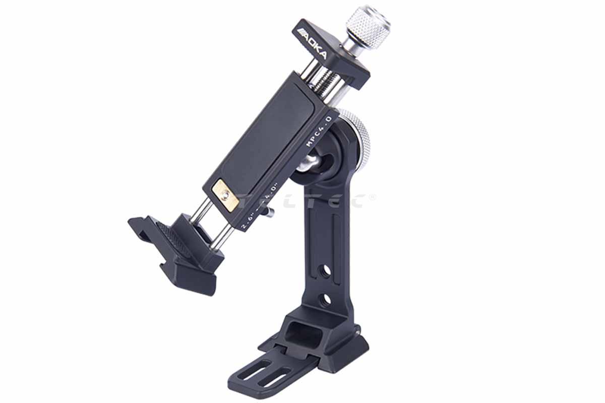 Der AOKA MPC4.0 Smartphone Halter Multifunktional ist ein aus Aluminium gefertigte Halter und ist universell einsetzbar, entweder auf einem ARCA-SWISS-kompatiblem Stativ, direkt auf dem Tisch oder einer flachen Basis. Smartphones zwischen 67-102mm Breite passen in die Klemme. Für sicheren Halt sorgen gummierte Haltebacken und eine Gummibeschichtung der Klemme. Das 360° Kugelkopf-Design erleichtert die Grundausrichtung. Auf der Rückseite befinden sich zusätzlich zwei 1/4'-Gewinde.