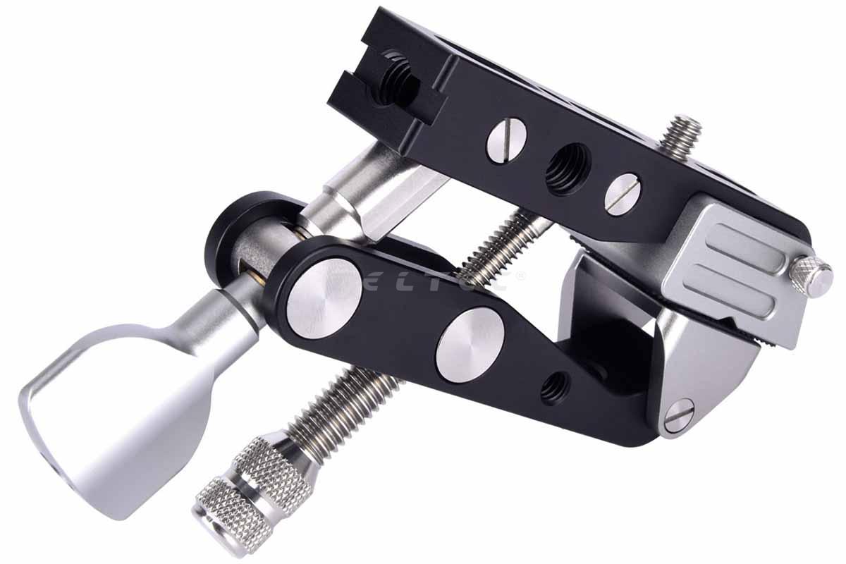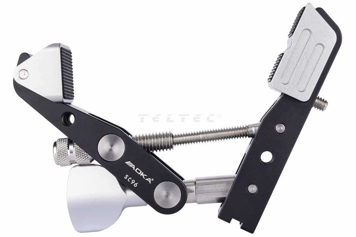 Die AOKA SC96 ist eine universelle stabile Klemme, mit vielen ¼“ und 3/8“ Bohrungen zu fast jeder Seite, für allerlei Anschlussvarianten. Große Klemmweite bis 8 cm. Durch die Schnabelform auch für Rohre geeignet. Mit ¼“ Schraube und 3/8“ Übergewinde auch direkt für Kugelköpfe geeignet.