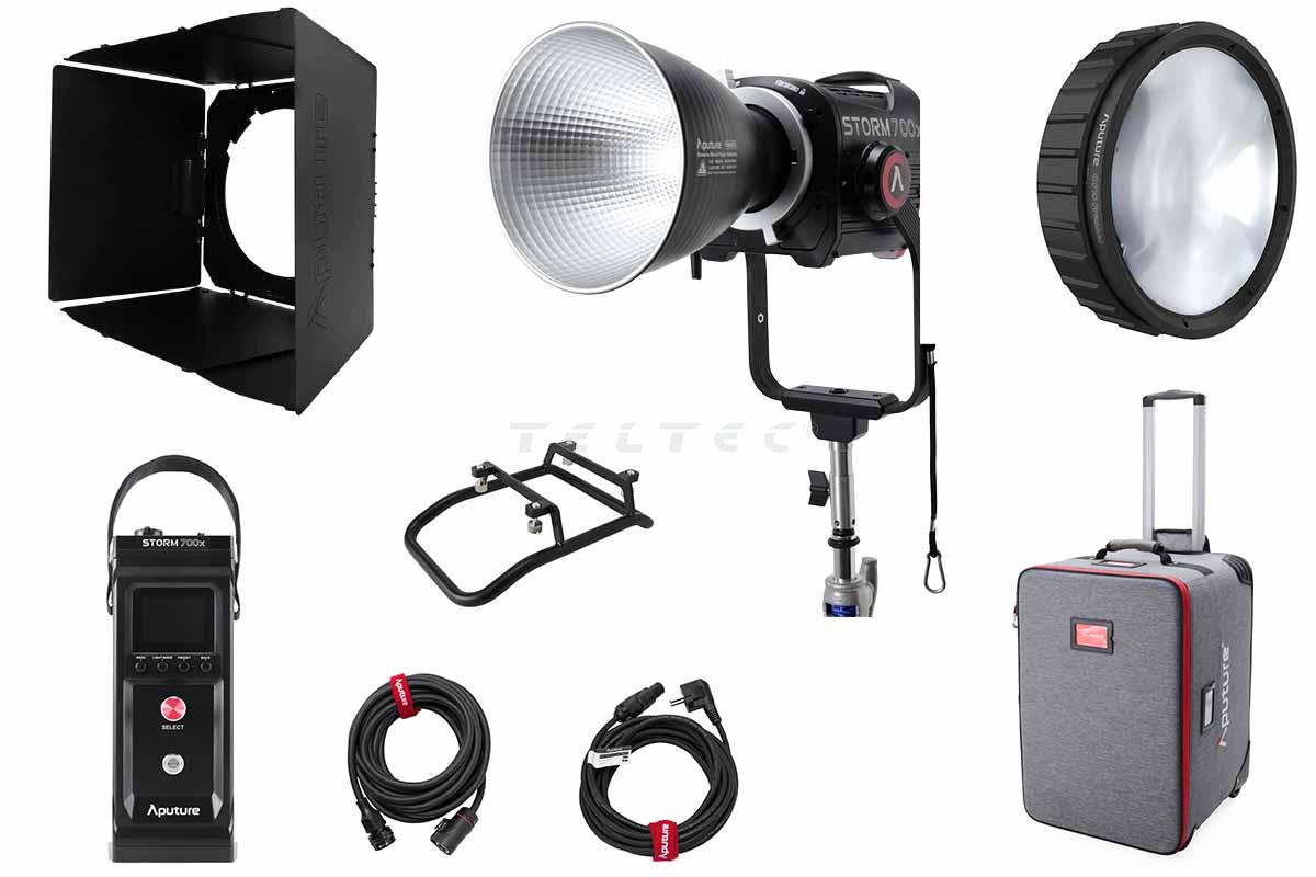 Das Aputure STORM 700x Cine Kit umfasst neben der STORM 700x Leuchte auch das CF10 Fresnel and Barn Doors Kit sowie das Aputure STORM 700x Skid.