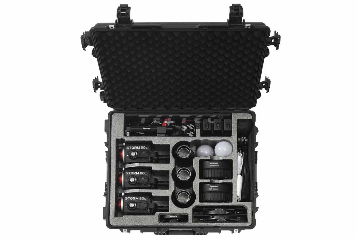 Das Aputure Storm 80c 3-Light Kit umfasst 3 Leuchten sowie passendes Zubehör . Die Aputure STORM 80c ist eine kompakte 80-W-Lampe mit variabler Farbeinstellung und ist mit der neuen BLAIR-CG-Light-Engine (Blue/Lime/Amber/Indigo/Red/Cyan/Green) ausgestattet, die ein größeres Farbspektrum bietet als jeder andere professionelle LED-Scheinwerfer auf dem Markt. Der Mini ProLock ist eine kleine Version des ProLock Bowens Mount mit Arretierung von Aputure. Er hält die Modifier fest an ihrem Platz und sorgt für eine korrekte Ausrichtung der Optik. Die Lampe kann über AC-Netzteil, V-Mount-Batterien oder USB-C mit Strom versorgt werden.