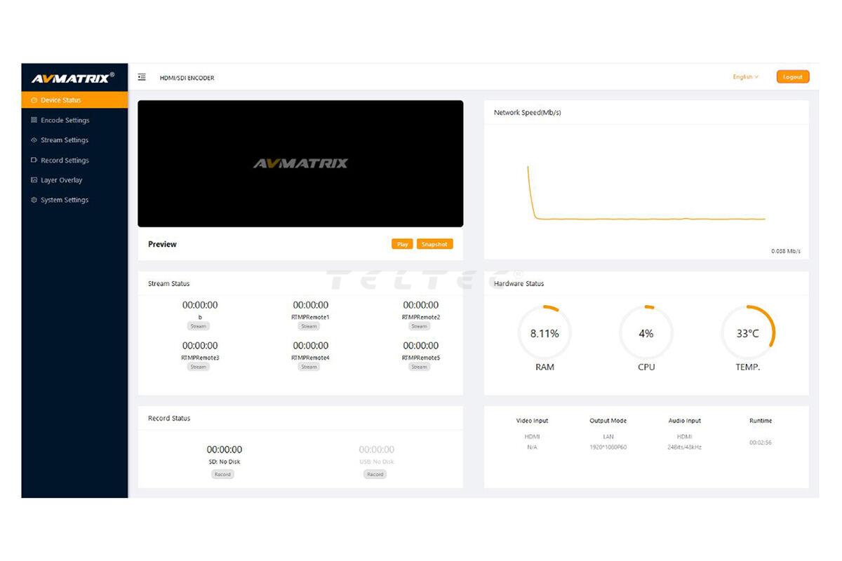 Der AVMatrix SE2017 SDI/HDMI Encoder & Recorder ist ein H.264 Streaming Encoder mit SDI- und HDMI-Eingängen. Er hat einen integrierten Rekorder und kann damit Videos (mit bis zu 1080p60Hz, 32 Mbps) auf USB-Sticks oder auch SD-Karten aufzeichnen, was ein zusätzliches Gerät dafür unnötig macht. Zudem unterstützt der Encoder eine Vielzahl von Streaming-Protokollen wie RTSP, RTMP(S), SRT, HTTP-FLV sowie Uni- und Multicast. Somit kann das Publikum mit Leichtigkeit auf verschiedenen Plattformen wie YouTube, Facebook oder Twitch erreicht werden, während alles in guter Qualität und mit einfachen Einstellmöglichkeiten läuft. Dabei kann der Inhalt auf bis zu 6 Plattformen gleichzeitig gestreamt werden. Der USB-C-Ausgang kann als Webcam zur Video- und Audioaufzeichnung genutzt werden. Mit seinem 3G-SDI und HDMI Dual-Interface-Eingang/Loop-Ausgang kann dieser vielseitige Encoder sich mit einer breiten Auswahl an Videoquellen verbinden. Über einen 3,5-mm-Eingang kann auch noch Audio in einen Livestream eingespeist werden. Betrieben werden kann das SE2017 entweder klassisch über ein Netzteil oder auch über PoE. Es hat einen integrierten OLED-Bildschirm, auf dem in Echtzeit etwa Status-Infos abgelesen werden können, während die Web-Oberfläche eine Reihe Funktionen einstellen lässt.