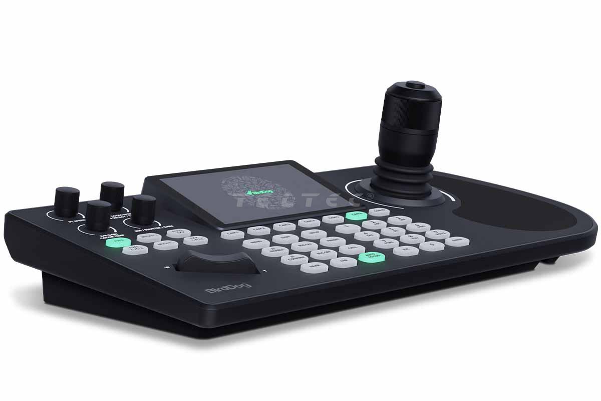 Das BirdDog KBD ist ein PTZ-Controller der die Steuerung von bis zu 255 Kameras übernimmt. Der Controller verfügt über ein Display, welches zum Einen das Live-Bild einer Kamera zeigt, aber auch Zugriff auf das User Interface bietet. Die Menüansicht ist dabei zwischen dem Hell- und Dunkelmodus umschaltbar. Für das Live-Bild ist eine Multiviewansicht von bis zu 4 Kameras gleichzeitig, wie auch eine Vollbildansicht eines einzelnen Kamerabildes möglich. Durch die nahtlose Integration in Plattformen wie TriCaster oder vMix wird das ausgewählte Bild auf dem Display des KBD von einem Tally-Rahmen umgeben, um die Sichtbarkeit eines "Program" oder "Preview" Signals zu visualisieren. Darüber hinaus ist der Controller mit einem 4D-Joystick ausgestattet, der über einen Feinabstimmungs-Modus verfügt und die Empfindlichkeit des Joysticks um das 10-fache erhöht. Von 36 hintergrundbeleuchteten Tasten, erlauben 6 den direkten Zugriff auf eine verbundene Kamera, während weitere Tasten zur Fokussierung, zum Weißabgleich oder für Presets dienen. Für die PTZ-Steuerung stehen verschiedene Protokolle, wie VISCA-IP, NDI, ONVIF, PELCO-P oder PELCO-D zur Verfügung. Darüber hinaus sind mit RS-232 und RS-422 zwei serielle Schnittstellen integriert. Per RJ45-Anschluss ist die Stromversorgung via Power-over-Ethernet möglich. Alternativ gibt es einen DC-12-V-Anschluss.