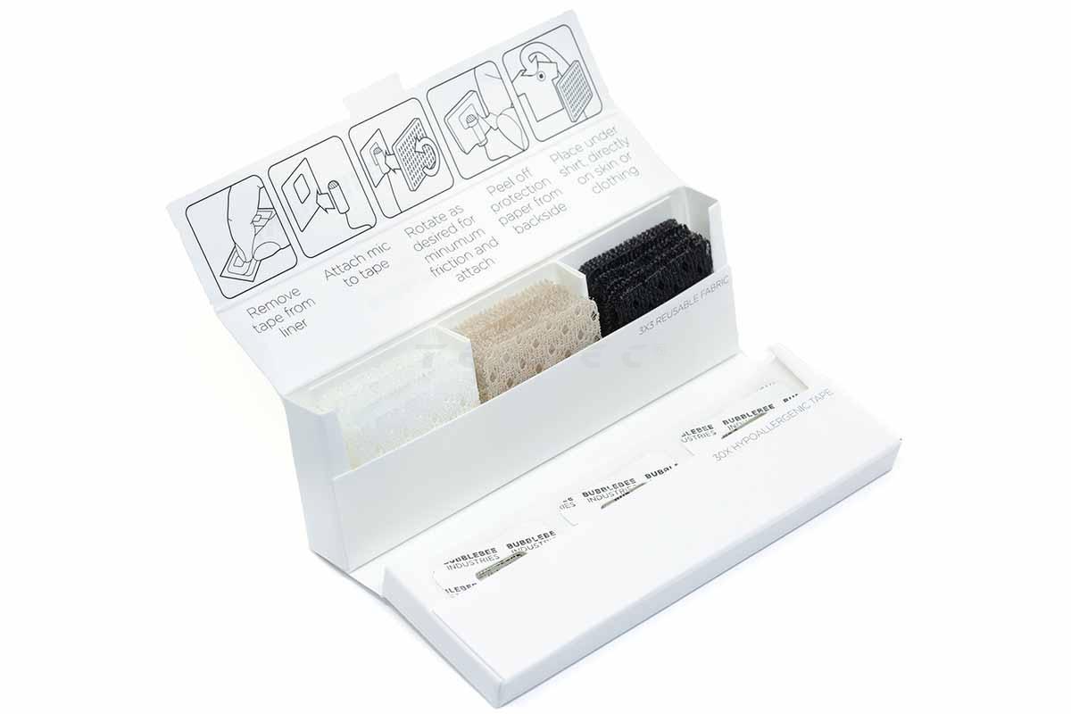 Die Bubblebee The Invisible Lav Covers Original sind eine Abdeckung und Befestigung für Lavalier-Mikrofone. Mit ihnen können die Mikrofone ganz einfach mit dem Klebeband dank hypoallergenen Eigenschaften direkt auf der Haut oder an Kleidung angebracht und mit dem Stück Stoff abgedeckt und somit versteckt werden. Während die 30 Klebestreifen nach jeder Nutzung gewechselt werden sollten, können die 3 x 3 Stoffstücke mehrmals verwendet werden.
