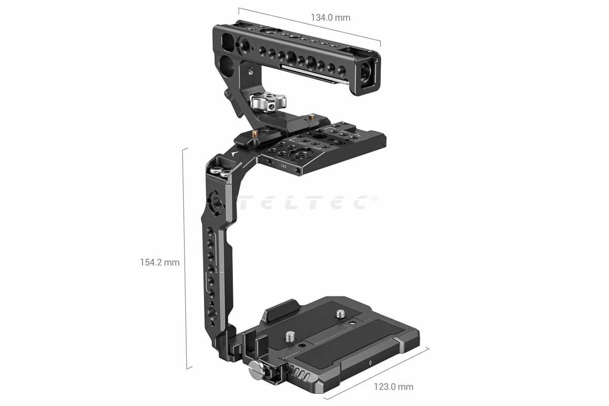 Das SmallRig 3899 Handheld Kit für Canon EOS C70 ist speziell für die C70 angepasst. Neben dem Kameraschutz und komfortablen Handling der Kamera sind zahlreiche Befestigungspunkte für Zubehör vorhanden. Die obere Platte, die Grundplatte und die Seitenplatte können zu einem halben Cage zusammengebaut werden, der die ursprüngliche Griffeinheit und die Mikrofonhaltereinheit trägt. Die so gebaute Basis besteht aus einer Grundplatte und einer abnehmbaren verlängerten Grundplatte. Es kann direkt auf DJI RS 2/RSC 2-Stabilisatoren und Acra-Swiss-Stative montiert werden, indem einfach die verlängerte Grundplatte entfernt wird, was einen schnellen Wechsel zwischen Handheld-, Stabilisator- und Stativaufnahmen ermöglicht. Das Kit wird außerdem mit einer HDMI-Kabelklemme geliefert, um eine versehentliche Signaltrennung zu verhindern und eine stabile Datenübertragung zu gewährleisten und bietet vollen Zugriff auf den Original-Kameragriff und die Tasten.