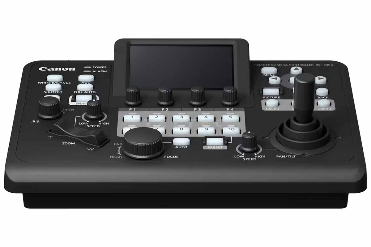 Der Canon RC-IP300 ist ein leistungsstarker PTZ-Controller, der speziell für die Steuerung anspruchsvoller von Multi-Kamera-Setups entwickelt wurde. Ein einzelner Operator übernimmt dabei die Steuerung von bis zu 200 Kameras und kann pro Kamera bis zu 100 Presets abrufen und speichern. Das integrierte 3,5-Zoll-Touchscreen-Display bietet eine komfortable Vorschau und lässt sich um 25° neigen. Gleichzeitig können bis zu 9 Kamera-Feeds übersichtlich dargestellt werden. Die Überwachung von Video- und Eingangssignalen erfolgt bequem über IP. Für eine präzise und intuitive Steuerung sorgen der präzise Joystick sowie ein ergonomisch gestaltetes Tasten- und Wahlrad-Layout, das auch bei längeren Einsätzen höchsten Bedienkomfort gewährleistet. Die Stromversorgung erfolgt flexibel entweder über PoE (Power over Ethernet) oder das im Lieferumfang enthaltene 12V-Netzteil.