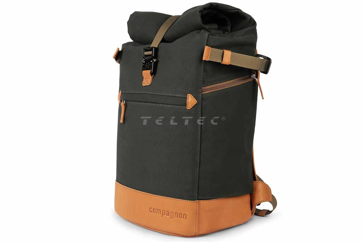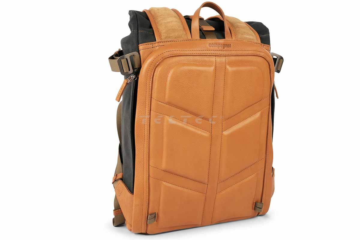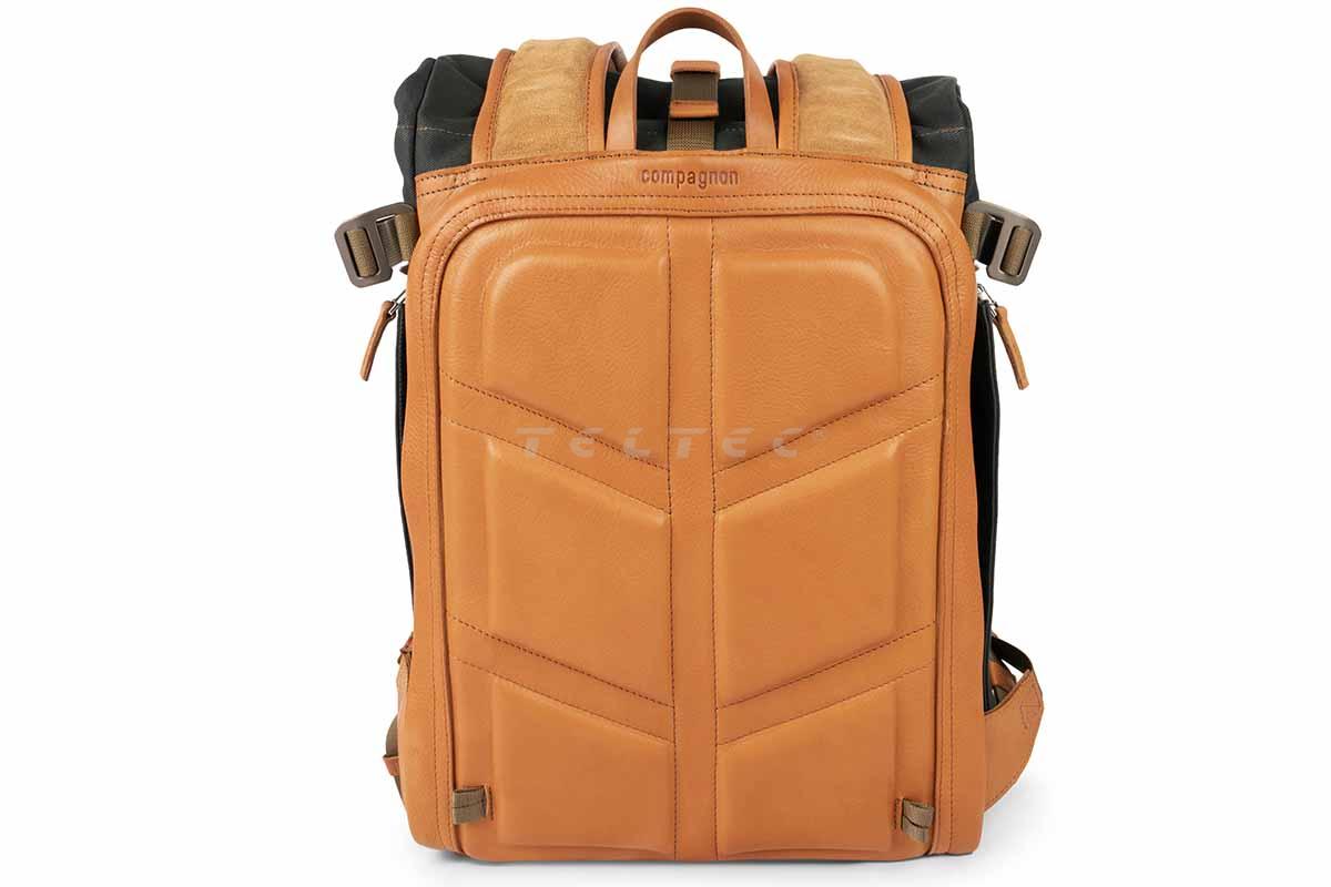Der Compagnon backpack Gen III (Grün/Hellbraun) ist ein robuster und geräumiger Kamerarucksack mit Rolltop. Während der Rucksack an sich ein Volumen von 24 Litern besitzt, erweitert das Rolltop dieses Volumen um weitere 8 Liter. Es lässt sich per Magnet sicher verschließen, bei Bedarf aber auch schnell öffnen. Die Schultergurte bieten eine breite Auflagefläche, die gut gepolstert und schön geformt ist. Zusammen mit dem Brustgurt wird für einen idealen Sitz gesorgt. An den Seiten gibt es jeweils einen Köcher für z.B. Trinkflaschen und Stative, welche dann mittels Militärnylongurte mit Alu-Haken fixiert werden können. Front und Boden des Rucksacks sind verstärkt, um die Form zu behalten und besser stehen zu können. Das lederne Rückenpanel ist mit einer bequemen Schaumstoffpolsterung unterlegt, um zum Tragekomfort beizutragen. Damit es nicht zu Wärme- und Feuchtigkeitsstaus kommt, sind Belüftungskanäle eingearbeitet. Vorne bietet der Rucksack eine schmale Einschubtasche für kleinere Gegenstände, das Hauptfach allerdings ist nur über die Rückseite oder das Rolltop zu erreichen. Dort gibt es auch ein 15"-Laptop-Fach, das über einen Reißverschlusszugang erreichbar ist, ohne den Rucksack komplett öffnen zu müssen. Im Rolltop-Staubereich gibt es einen herausnehmbaren Klettboden, falls mehr Platz im Hauptfach benötigt wird. Ansonsten trennt er die beiden Stauräume optimal voneinander. Das Hauptfach ist rundum gepolstert und mit insgesamt 14 Klettpolstern individuell anpassbar. Zwei davon sind besonders lang und faltbar. Für zusätzliche Sicherung der Ausrüstung gibt es 8 klettbare Leder-Fixierbänder. Eine innenliegende Reißverschlusstasche im Rolltop ist ideal für wichtige Dokumente und Bargeld geeignet. Außerdem gibt es noch drei zusätzliche Mesh-Taschen mit Reißverschluss, die mittels Klett frei im Stauraum platziert werden können.