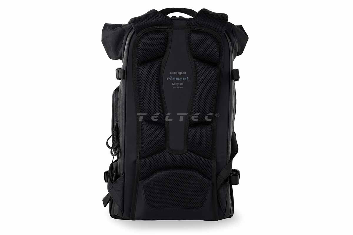 Der Compagnon Element Backpack 20L Volcano Black ist ein robuster Outdoor-, Reise- und Kamerarucksack mit 20 Liter Volumen. Sein stark wasserabweisendes Äußeres schützt den Inhalt vor Nässe und Schmutz. Es besteht aus einem mehrschichtigen Segeltuchmaterial mit extrem starkem Gewebe und hält daher auch enorme Belastungen aus. Das Rolltop, welches zusätzliches Volumen bietet, ist einerseits mit einer optionalen Klettklappe mit Silencer-Funktion, andererseits mit einem magnetischen Verschluss versehen, der sich leicht und schnell öffnen, aber auch sicher schließen lässt. Mehrere Seiteneinschübe erlauben das Verstauen von Wasserflaschen, Stativen und Gimbals in verschiedenen Größen. Fixiergurte helfen dabei, die Gegenstände organisiert zu halten. Außerdem verfügen die ebenfalls seitlichen Schnellzugriffe sowie die Fronttasche über Karabinerhaken, welche die Reißverschlüsse sichern und unerlaubten Zugriff verhindern können. Für Tragekomfort sorgen das CarryLite ergo Tragesystem, das mit 3D AirMesh Polsterung aufwartet, sowie ErgoBelt Hüftflossen und Hüftgurt, die die Schultern und den Rücken entlasten und schonen. Für bestmöglichen Tragekomfort sollte die Körpergröße maximal 175 cm betragen. Im Taschenboden befindet sich ein verstecktes Fach für den Überwurf, der (ohne Rucksack) leicht unter Wasser gereinigt werden kann. Außerdem gibt es am Boden noch eine Schlaufe, in die ein Licht eingehängt werden kann. Das rundherum gepolsterte Hauptfach kann mit insgesamt 9 Klettpolstern individuell angepasst werden. Die drei großen Polster (1x L, 2x M) haben zudem eine Faltfunktion, drei der kleinen verfügen über Flex-Einschübe für kleines Zubehör wie Filter, Akkus oder Batterien. Zusätzlich zu den Klettpolstern gibt es ebenfalls 10 klettbare Fixierbänder, um kleine Teile oder besonders schweres Equipment zu sichern. Die Trennwand zwischen Rolltop und Hauptfach hat einen Reißverschluss, genauso wie die im Rolltop befindliche Tasche für z.B. Geldbeutel und Reisedokumente. Für weiteren Alltagsbedarf gibt es eine geräumige Fronttasche mit RV-Fach und Einschubtasche. Außerdem verfügt der Rucksack über ein gepolstertes Laptop-Fach für bis zu 13 Zoll große Geräte, welches sich erreichen lässt, ohne den Rucksack komplett öffnen zu müssen. Zusätzlich dazu gibt es hinter dem Laptop-Fach eine Isomatte und einen Speicherkartenhalter für mindestens 6 Karten sowie zwei zusätzliche Meshtaschen.