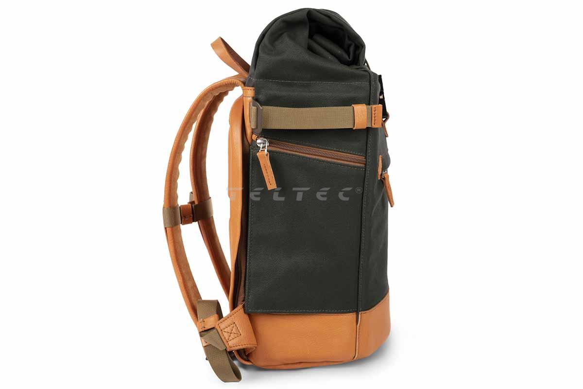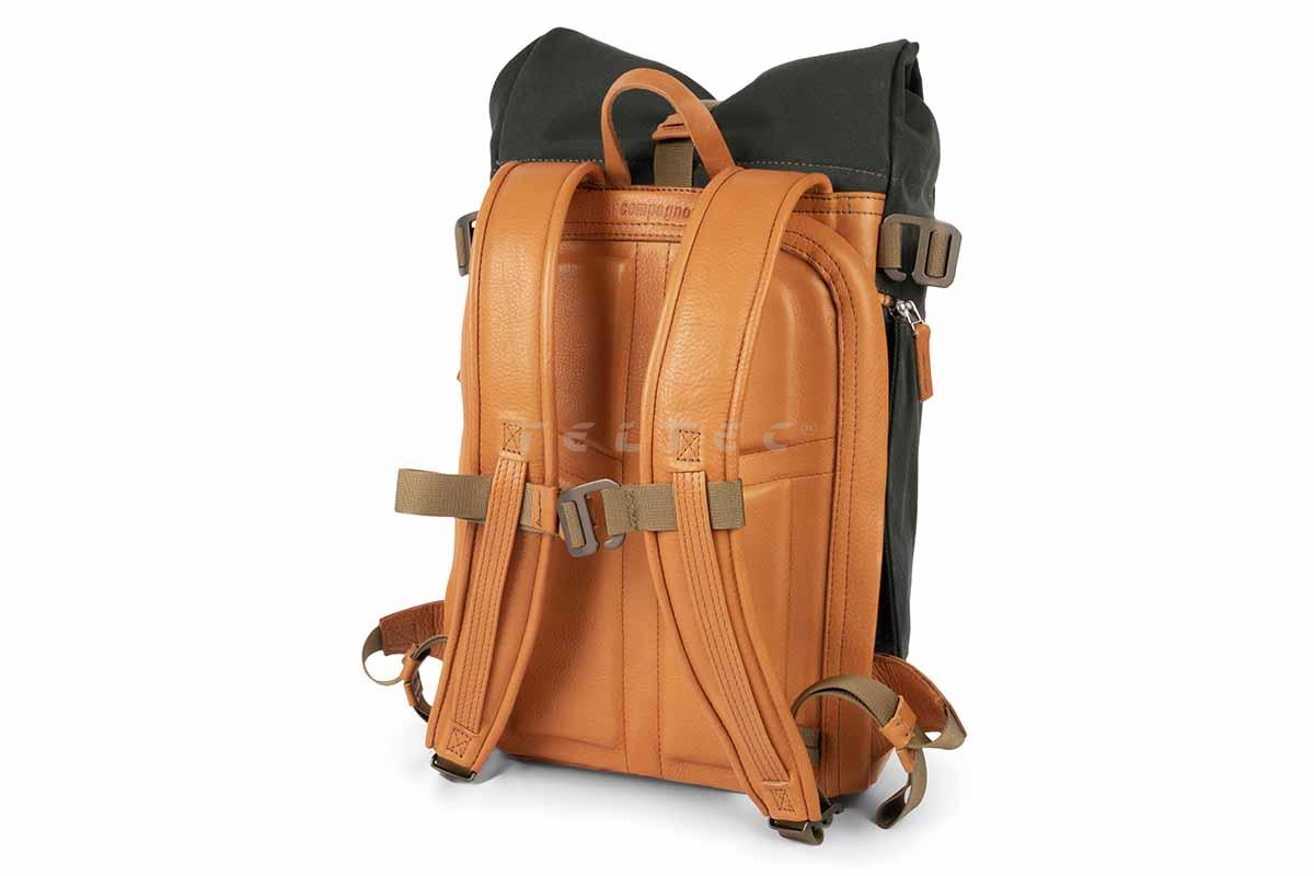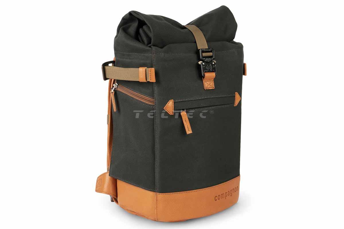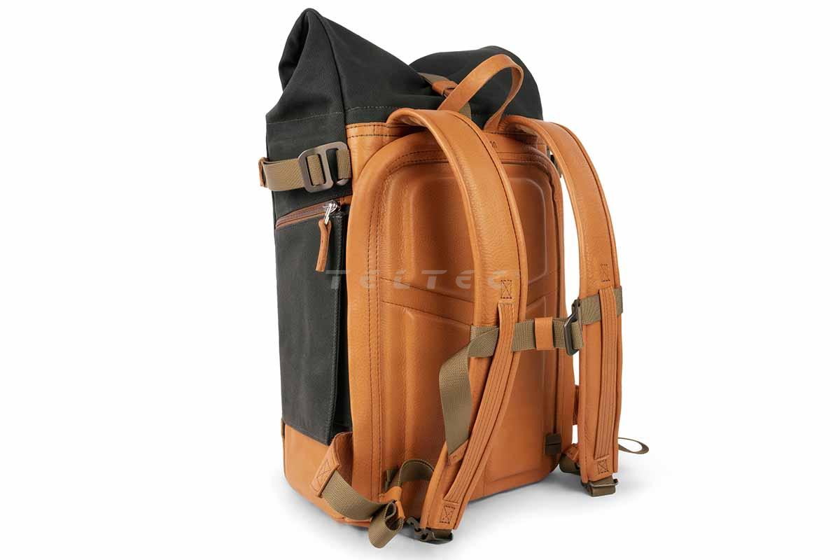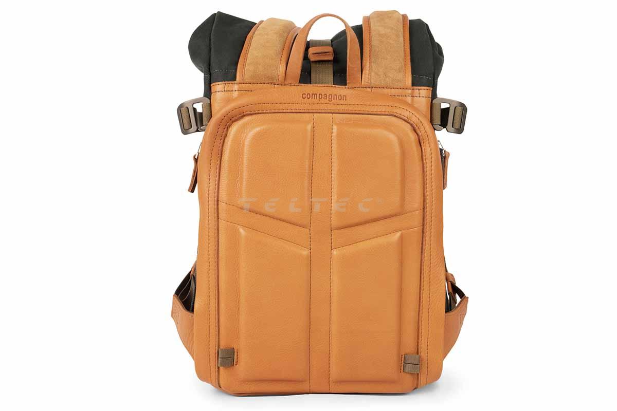 Der Compagnon little backpack Gen III (Grün/Hellbraun) ist ein robuster und kompakte Kamerarucksack mit Rolltop. Während der Rucksack an sich ein Volumen von 12 Litern besitzt, erweitert das Rolltop dieses Volumen um weitere 6 Liter. Es lässt sich per Magnet sicher verschließen, bei Bedarf aber auch schnell öffnen. Die Schultergurte bieten eine breite Auflagefläche, die gut gepolstert und schön geformt ist. Zusammen mit dem Brustgurt wird für einen idealen Sitz gesorgt. An den Seiten gibt es jeweils einen Köcher für z.B. Trinkflaschen und Stative, welche dann mittels Militärnylongurte mit Alu-Haken fixiert werden können. Front und Boden des Rucksacks sind verstärkt, um die Form zu behalten und besser stehen zu können. Das lederne Rückenpanel ist mit einer bequemen Schaumstoffpolsterung unterlegt, um zum Tragekomfort beizutragen. Damit es nicht zu Wärme- und Feuchtigkeitsstaus kommt, sind Belüftungskanäle eingearbeitet. Vorne bietet der Rucksack eine schmale Einschubtasche für kleinere Gegenstände, das Hauptfach allerdings ist nur über die Rückseite oder das Rolltop zu erreichen. Dort gibt es auch ein 13"-Laptop-Fach, das über einen Reißverschlusszugang erreichbar ist, ohne den Rucksack komplett öffnen zu müssen. Im Rolltop-Staubereich gibt es einen herausnehmbaren Klettboden, falls mehr Platz im Hauptfach benötigt wird. Ansonsten trennt er die beiden Stauräume optimal voneinander. Das Hauptfach ist rundum gepolstert und mit insgesamt 14 Klettpolstern individuell anpassbar. Zwei davon sind besonders lang und faltbar. Für zusätzliche Sicherung der Ausrüstung gibt es 8 klettbare Leder-Fixierbänder. Eine innenliegende Reißverschlusstasche im Rolltop ist ideal für wichtige Dokumente und Bargeld geeignet. Außerdem gibt es noch drei zusätzliche Mesh-Taschen mit Reißverschluss, die mittels Klett frei im Stauraum platziert werden können.