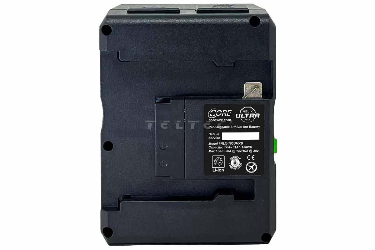 Der Core SWX Helix Max Ultra 160 V (HLX-160UMXV) ist ein leistungsstarker Li-Ion B-Mount Akku mit einer Kapazität von 158 Wh. Dank Dual-Voltage-Technologie liefert der Akku flexibel und je nach Anwendungsbedarf 14 V oder 24 V. USB-C und D-Tap Anschlüsse bietet eine zuverlässige Stromversorgung für Zubehörteile. Mit dem integrierten USB-C Port lässt sich der Akku auch ohne ein B-Mount Akkuladegerät laden. An der Seite ist ein Display angebracht sowie farbige LED-Indikatoren die den aktuellen Ladezustand anzeigen.