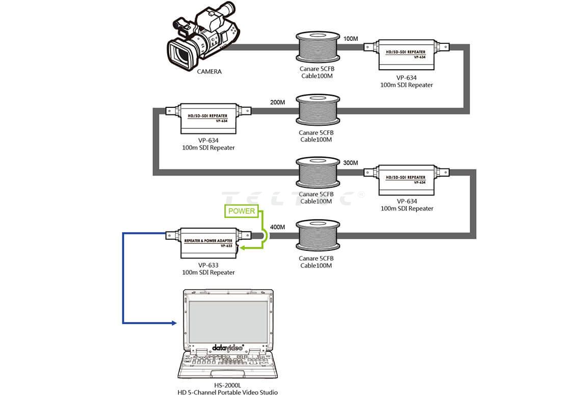 Mit dem VP-634 von Datavideo kann ein HD-SDI, SD-SDI oder 3G-Signal verstärkt und die Reichweite somit erhöht werden. Der VP-634 ist ein passiver Verstärker und benötigt daher zusätzlich einen VP-633 (nicht im Lieferumfang enthalten). An einen VP-633-Verstärker können mehrere VP-634-Verstärker angeschlossen werden. Jeder von ihnen verlängert dabei die maximale Signalreichweite um circa 200m. Insgesamt können bei einer Reihenschaltung somit bis zu 1000m (abhängig von der Kabelqualität) erreicht werden. Der VP-634 besitzt keine eigene Stromversorgung, sondern bezieht Strom vom VP-633.