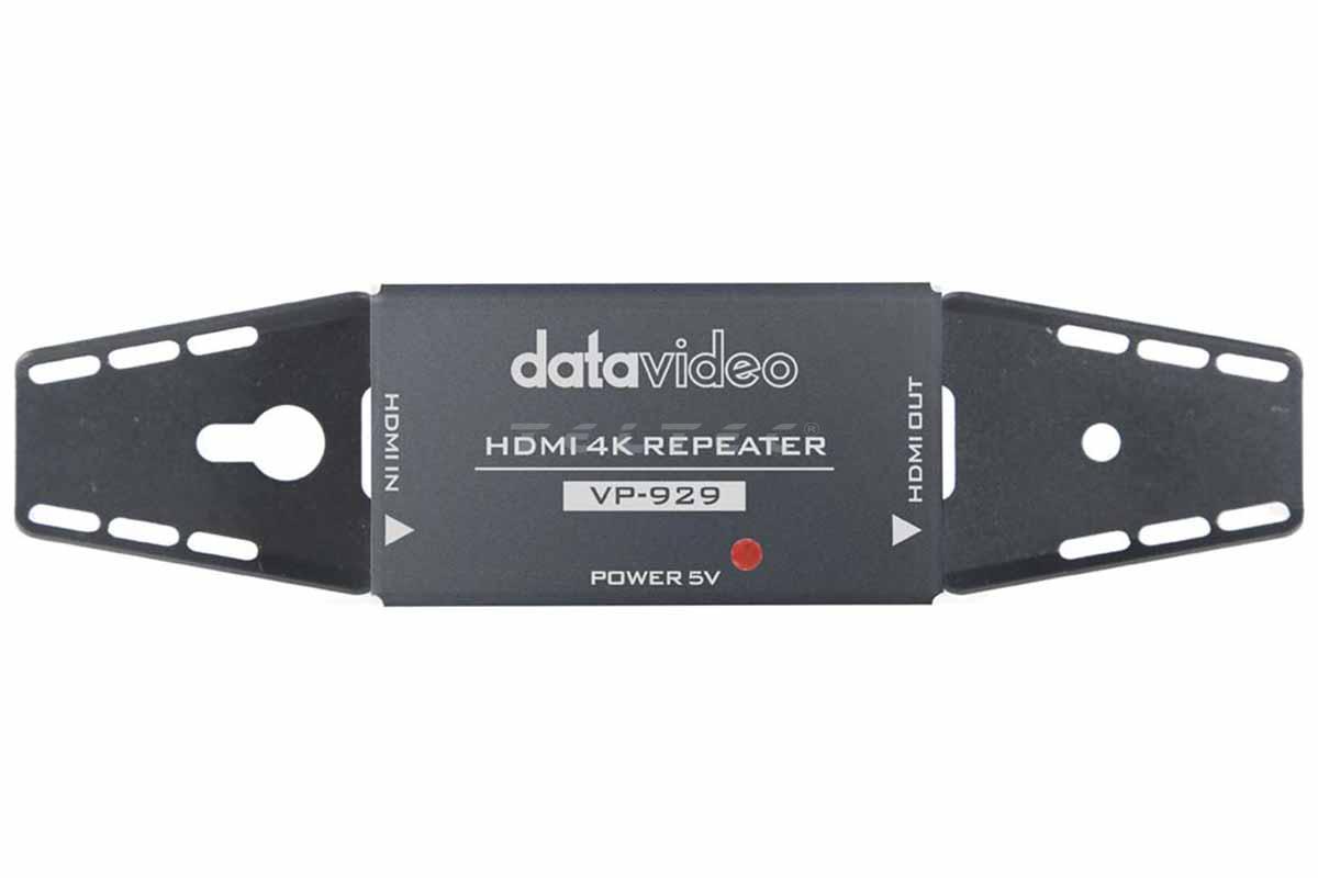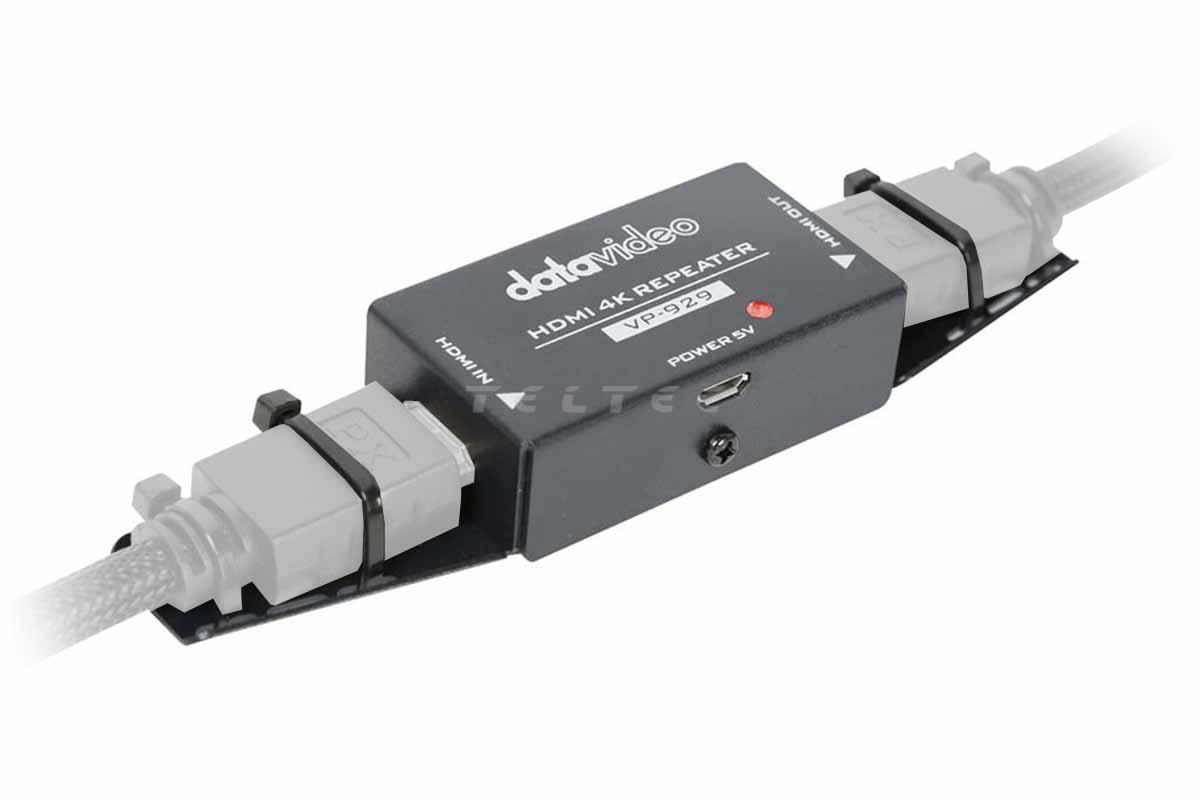 - Ein Datavideo VP-929 Signal Extender erweiterte die maximale Kabellänge bei 4K-Signalen um 10 m, bei HD-Signalen um 15 m (die Verwendung von hochwertigen HDMI Kabeln wird empfohlen.)