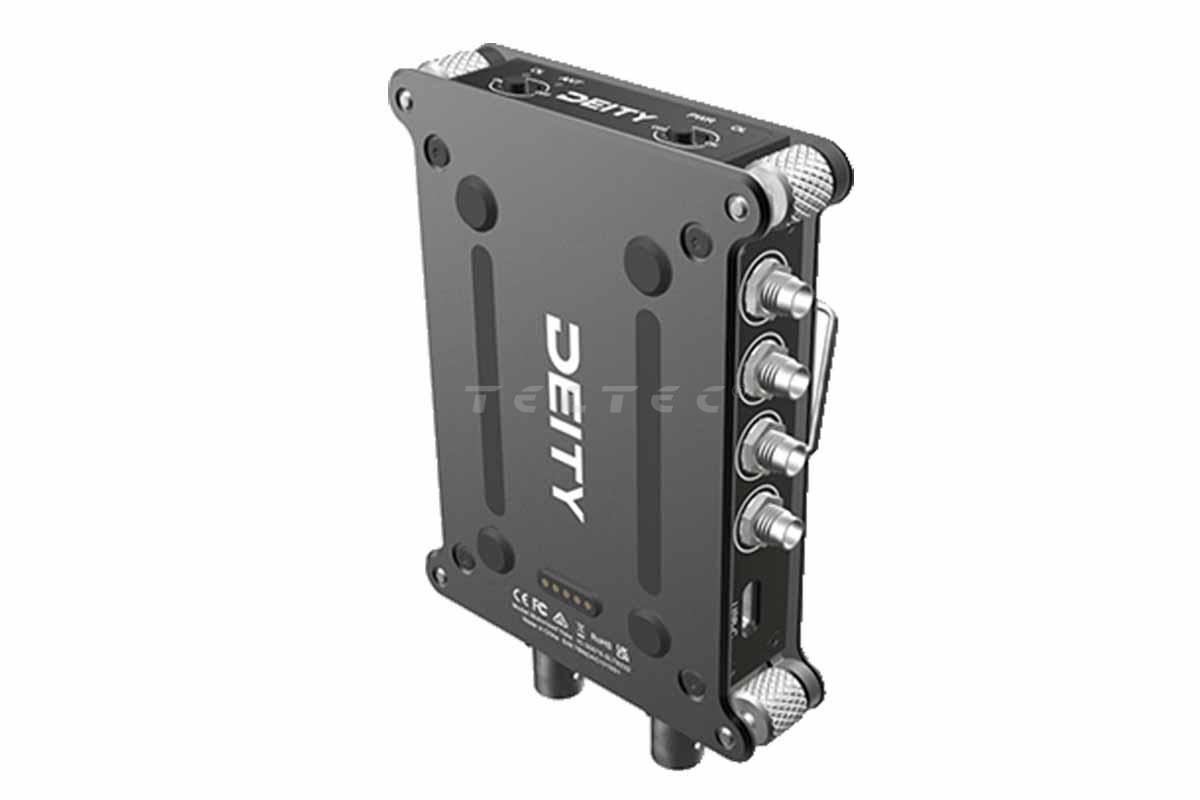 Das Deity SRD-Mini ist ein kompakter Splitter zur Stromverteilung. Er kann auch externe Antennenschaltungen versorgen, aktive wie passive. Die externe Stromversorgung auf jeder Seite des Verteiler kann individuell ein- und ausgeschaltet werden. Über jedem Kippschalter ist eine LED, welche angibt, ob das eingehende Signal den HF-Verstärker im SRD-Mini überlastet. Das Gerät bietet zwei 50-Ohm-BNC-Anschlüsse als A/B-Eingänge und acht 50-Ohm-SMA-Ausgänge, die das eingehende Signal aufteilen (1A x 4A / 1B x 4B). Der Betriebsbereich des SRD-Minis erstreckt sich von 470 MHz bis 960 MHz. Somit ist ein internationaler Einsatz mit fast jedem UHF-Drahtlosmikrofonsystem möglich. Zudem kann das SRD-Mini kabellos über die Pogo-Pins des SPD-Mini (separat erhältlich) mit Strom versorgt werden. Davon abgesehen gibt es aber auch traditionelle Stromeingänge wie ein 4-Pin-Hirose-kompatibler Eingang und USB-C.