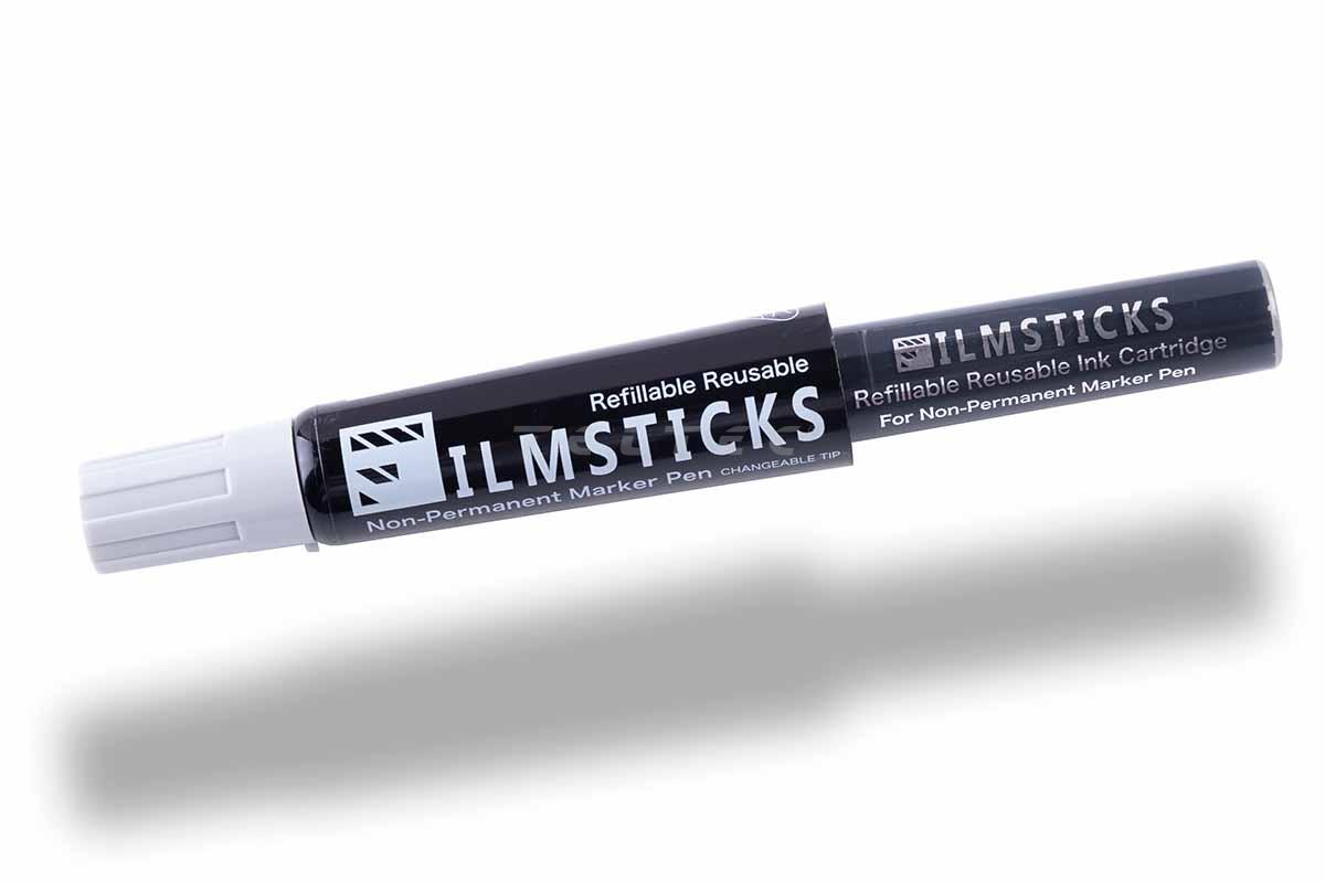 Das Filmsticks Re-Useable Marker Pen Kit ist ein Set bestehend aus dem wiederbefüllbaren nicht-permanenten Marker, einer Farbpatrone und zwei Stiftspitzen (1x rundlich, 1x keilförmig). Ein Vorteil dieses Stifts ist die austauschbare Farbpatrone, was verhindert, dass der ganze Stift entsorgt werden muss. Die Farbe ist auf Ölbasis und abwaschbar, was den Stift vielseitig einsetzbar macht.