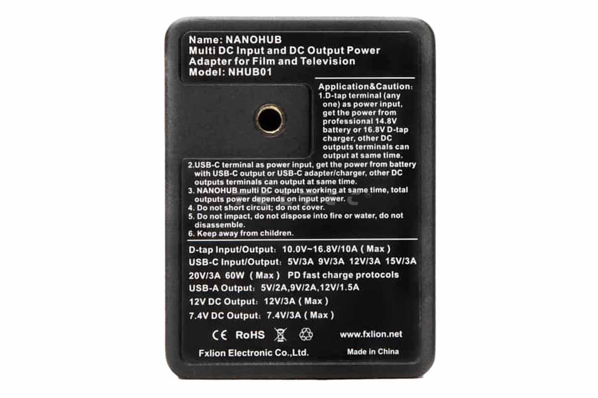 Das FXLion Nanohub ist ein Multispannungsnetzteil-Adapter mit USB-/D-Tap-/12-V-DC-Anschlüssen. Er ermöglicht das gleichzeitige Aufladen von Geräten über z.B. 12-V- und USB-Anschlüsse, während das Hub über D-Tap oder 14,8 V Akku betrieben wird. Der 7,4-V-Ausgang ist für DV und DSLR Kameras oder LED Leuchten geeignet. Smartphones und Laptops finden dort auch ihre passenden Anschlüsse. Das Nanohub weist eine 1/4"-Bohrung vor, um z.B. ans Equipment montiert werden zu können. Ein blauer Leuchtstreifen gibt über den Arbeitszustand Bescheid.