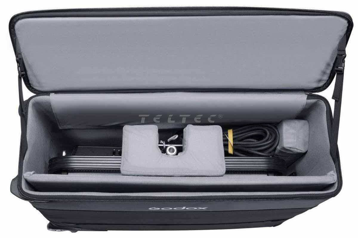 Die Godox P600R - RGB Panel LED Space Light ist ein professionelles RGB LED Space Light mit 650 W Leistung und einem Farbtemperaturbereich von 1.800 K- 10.000 K. Die Leuchte lässt sich von 100 % auf 0 % dimmen und bietet 16 integrierte FX-Modi. Die Steuerung kann On-Board, über DMX 512, CRMX, Ethernet (Art-Net & sACN) oder Bluetooth erfolgen. Zudem bietet die P600R Unterstützung für HIS-, RGBW-, GEL- und X-Y-Koordinatenachsen-Modi. Das Godox P600R K1 Kit beinhaltet neben der Leuchte und dem Standard-Zubehör noch eine Quick Setup Softbox und eine Transporttasche mit Rollen.