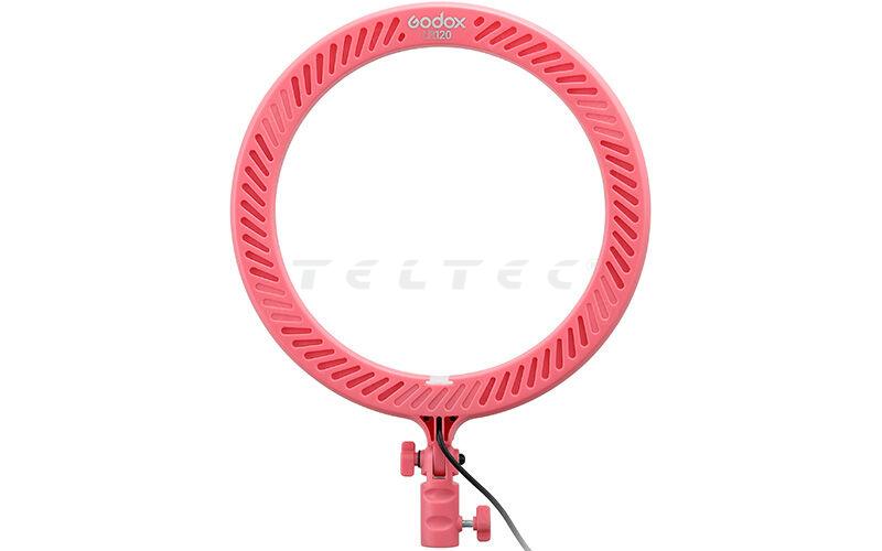 Der Godox LR120 LED Ring Light Pink ist eine dimmbare 10 W Bi-Color LED Ring-Soft-Leuchte mit einer einstellbaren Farbtemperatur von 3.000 K bis 6.000 K. Ausgestattet mit 222 LEDs, bietet die Leuchte einen CRI von >90 und einem TLCI von >90. Im Ring befindet sich eine Blitzschuh, der zur Befestigung der Smartphone-Halterung dient. Die Stromversorgung erfolgt über einen optionalen USB-Netzadapter.